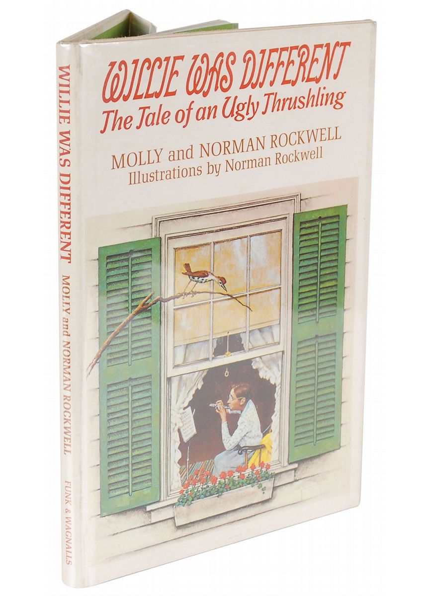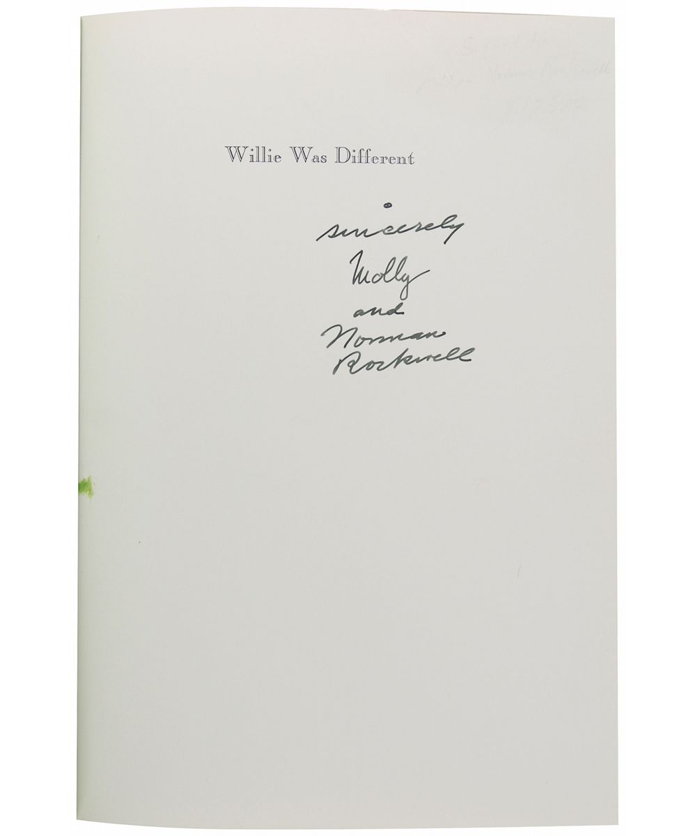 Signed book: Willie Was Different. Later printing. NY: Funk & Wagnalls, 1969. Hardcover with dust jacket, 7.25 x 10.25, 40 pages. Signed on the half-title page in fountain pen, “Sincerely, and Norman Rockwell,” with his wife signing above him, “Molly.” Erased pencil price notations to upper right of the half-title page and a price-clipped dust jacket, otherwise fine condition.