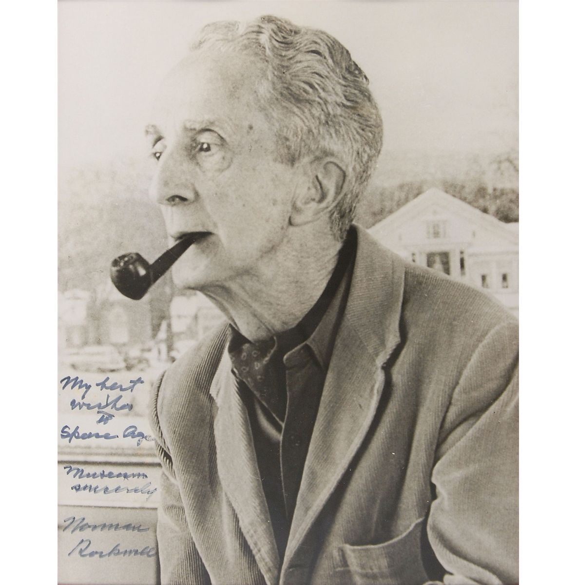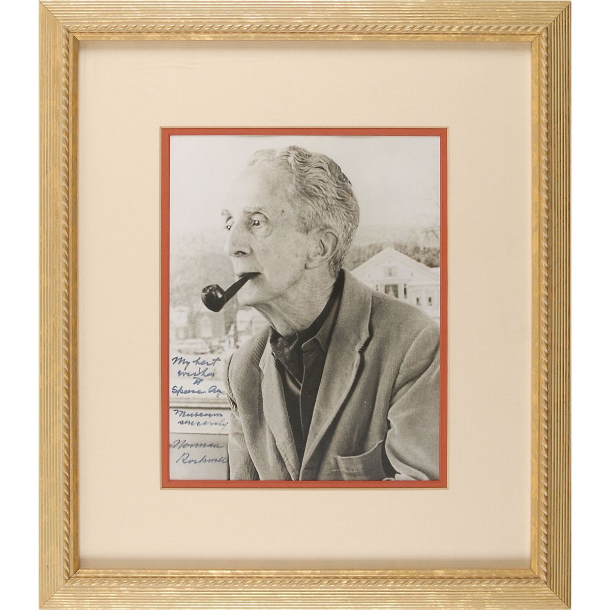 Classic matte-finish 6.75 x 8.75 photo of Rockwell smoking a pipe, signed and inscribed in black felt tip, “My best wishes to Space Age Museum, Sincerely, Norman Rockwell.” Double-matted and framed to an overall size of 13.5 x 16. In fine condition, with a bit of irregular adhesion to portions of the inscription.