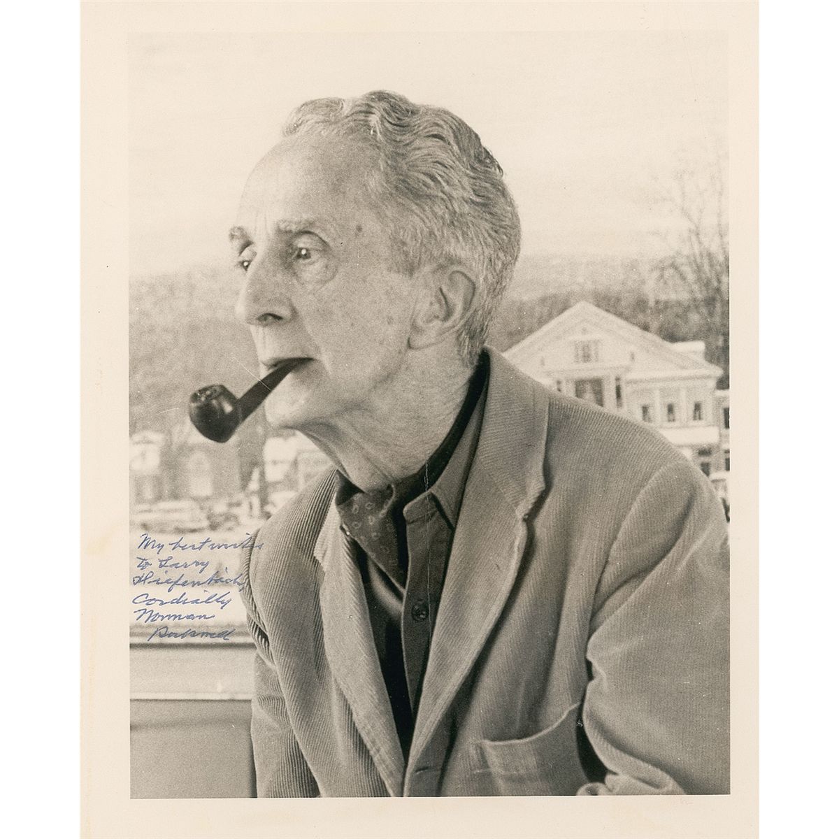 Handsome matte-finish 8 x 10 photo of the artist with a pipe clenched between his lips, signed and inscribed in blue ballpoint, “My best wishes to Larry Diefenbach, Cordially, Norman Rockwell.” A long but unobtrusive central vertical crease, otherwise fine condition.
