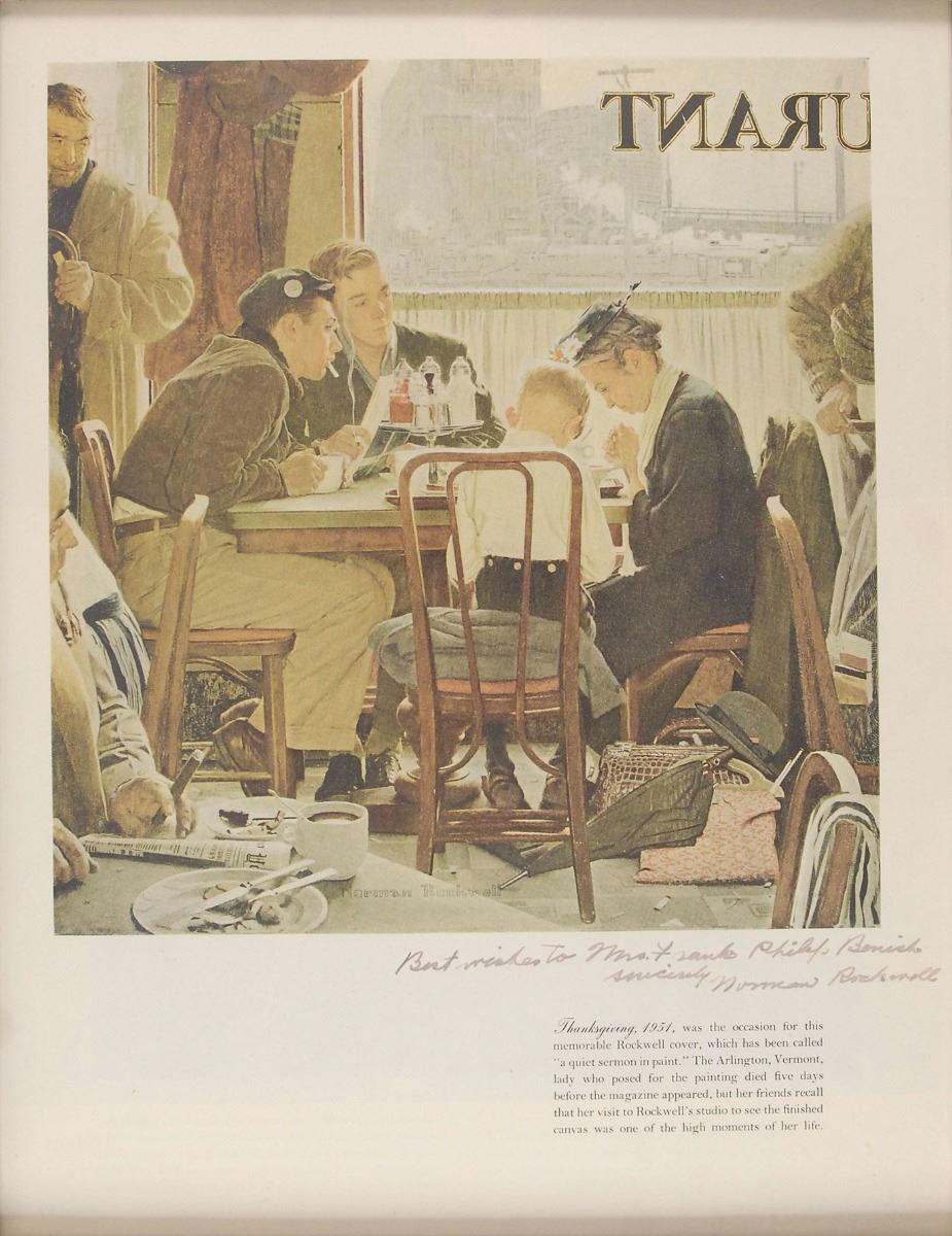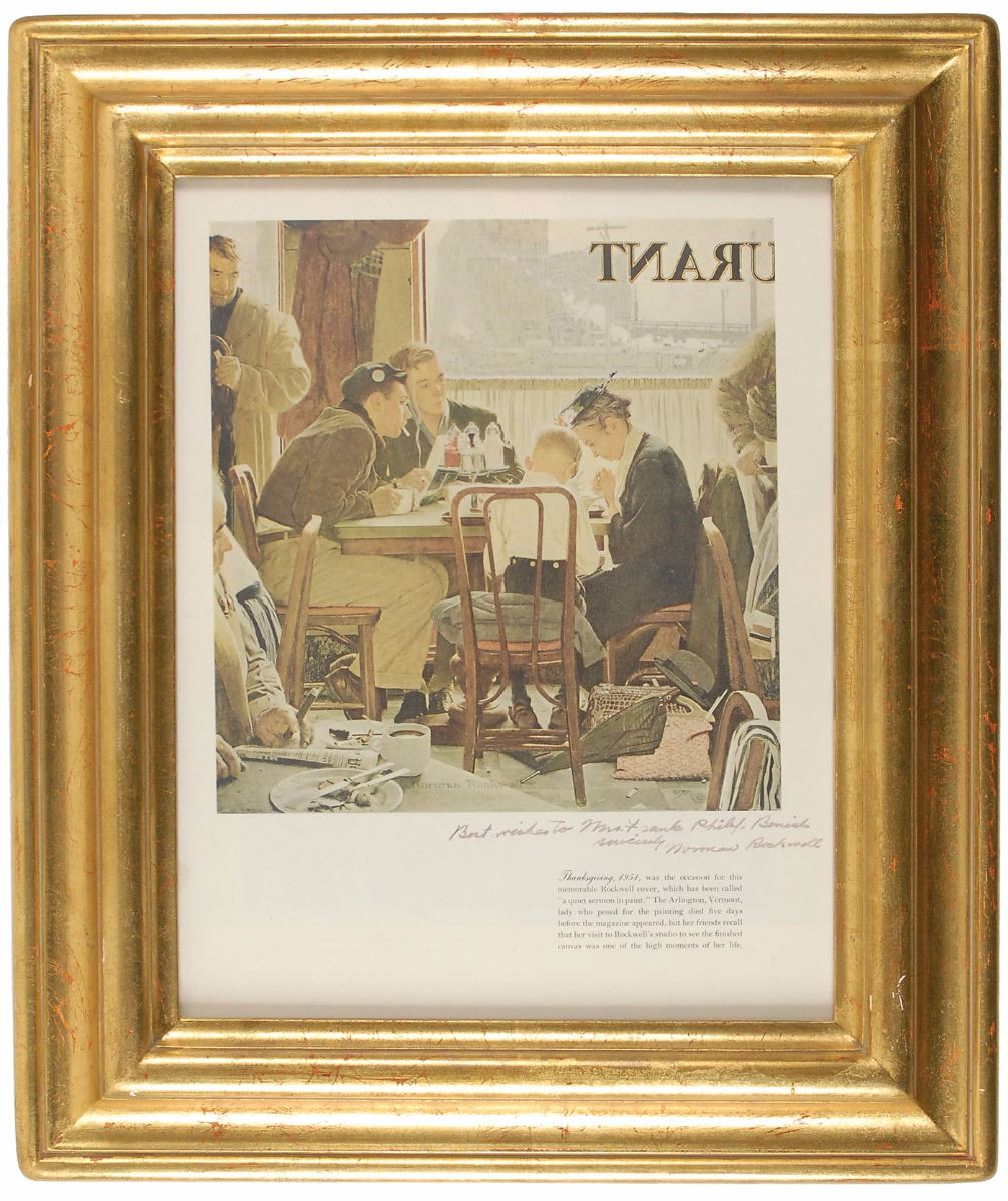 Color 10 x 13.25 magazine print of Rockwell’s famous scene entitled ‘Thanksgiving, 1951,’ signed and inscribed in the lower border in black felt tip, “Best wishes to Mrs. Frank Philip Benish, Sincerely, Norman Rockwell.” Framed to an overall size of 15.5 x 18.5. In fine condition, with subtle show-through from print to the opposing side.