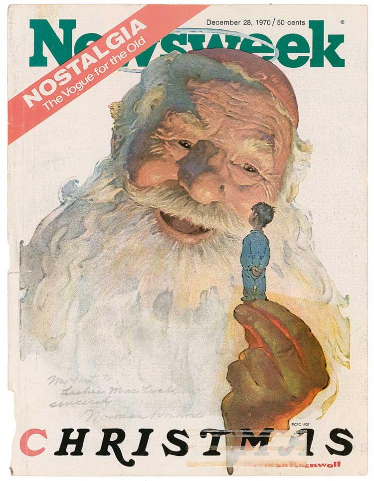 Magazine cover from the December 28, 1970, issue of Newsweek, signed and inscribed in black felt tip, “My best to Lachie MacLachlan, sincerely, Norman Rockwell.” In very good condition, with signature and inscription light, but legible, rough left edge, mailing label remnant along bottom, and some light creasing and soiling. RRAuction COA.