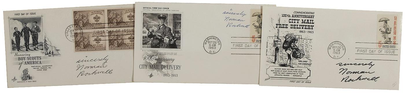 Three FDCs with various Rockwell-related cachets, each signed on the front in blue or black ink, “Sincerely, Norman Rockwell.” In overall fine condition. RRAuction COA.