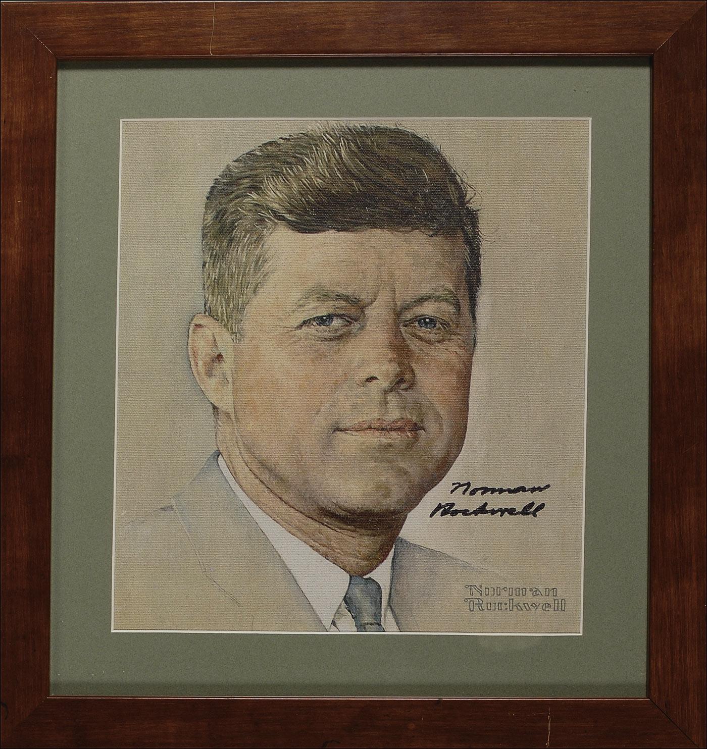 Color 10 x 11 textured print of Rockwell’s portrait of John F. Kennedy, the original of which was featured on the December 14, 1963, issue of The Saturday Evening Post, signed in black felt tip by Rockwell. Matted and framed to an overall size of 15 x 16. In fine condition. Accompanied by an unsigned copy of the issue of The Saturday Evening Post featuring Kennedy on the cover.