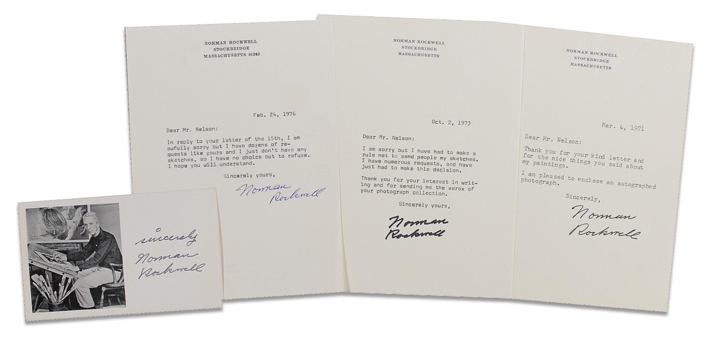 Three one-page TLSs from the 1970s on his personal letterhead, each 5.75 x 7.75, all to the same collector, one forwarding a signed photo and two stating he no longer sends out sketches; and a 5.5 x 3.5 postcard photo of Rockwell creating his art, signed in black felt tip, “Sincerely, Norman Rockwell.” In fine condition. Letters are accompanied by the original mailing envelopes.
