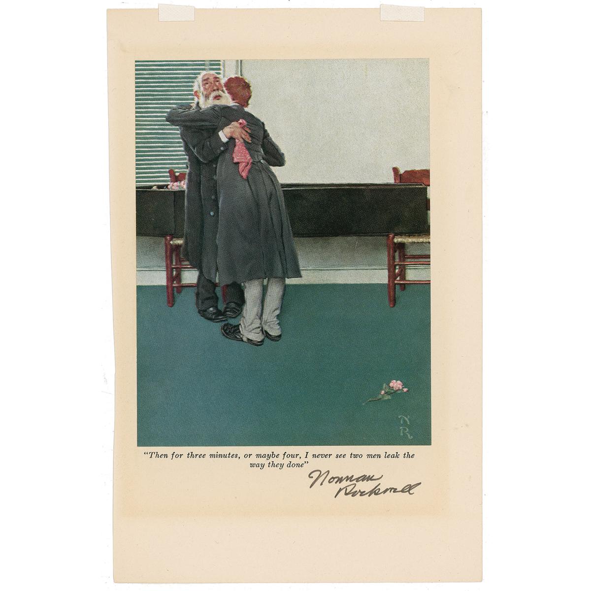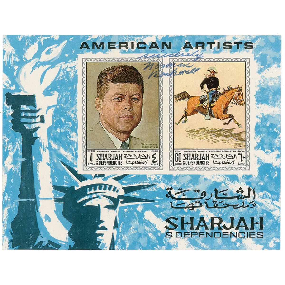 Signed color book photo, 6.25 x 9.5, of a work by Rockwell from Huckleberry Finn, signed in the lower border in black ink; and a Sharjah commemorative philatelic souvenir, featuring copies of two stamps with Rockwell works on them, signed in blue ink, “Sincerely, Norman Rockwell.” In fine condition, with light toning to photo, as well as two tape remnants to top edge.