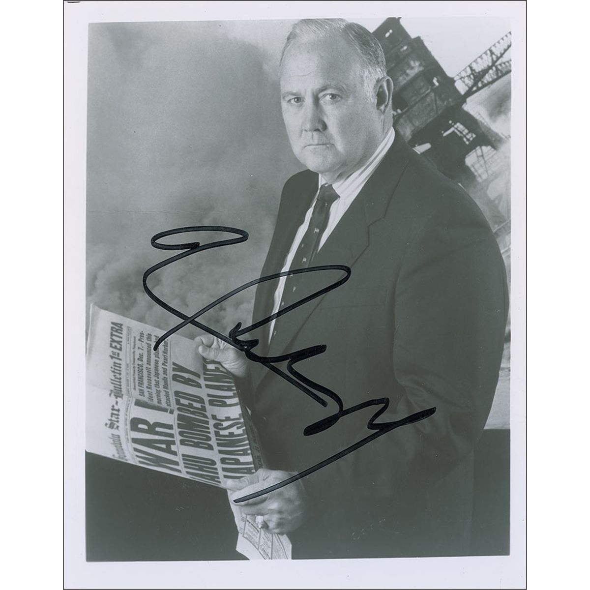 Glossy 8 x 10 photo of Schwarzkopf holding a paper with the headline, “WAR! Oahu Bombed By Japanese Planes,” signed in black felt tip. In fine condition.