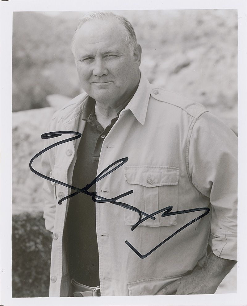 Glossy 8 x 10 photo of Schwarzkopf posing outdoors in civilian clothes, signed in black felt tip. In very fine condition.