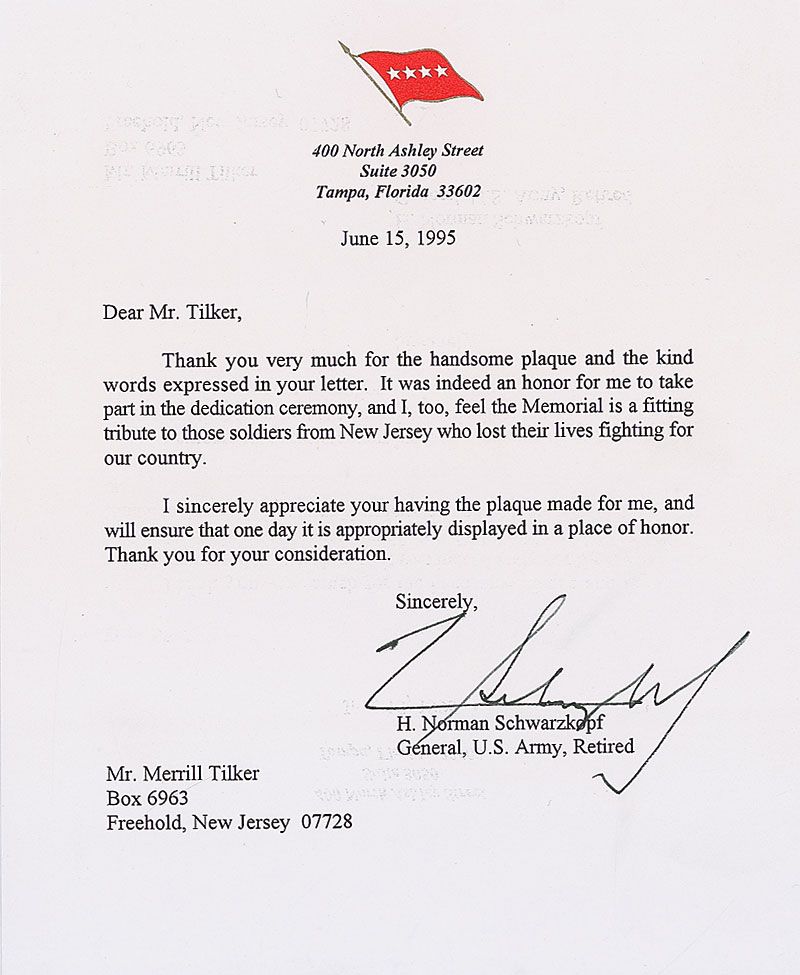 TLS, one page, 7 x 8.5, personal four-star letterhead, June 15, 1995. Letter to an admirer. In part: “I, too, feel the Memorial is a fitting tribute to those soldiers from New Jersey who lost their lives fighting for our country.” In fine condition. Accompanied by the original mailing envelope.