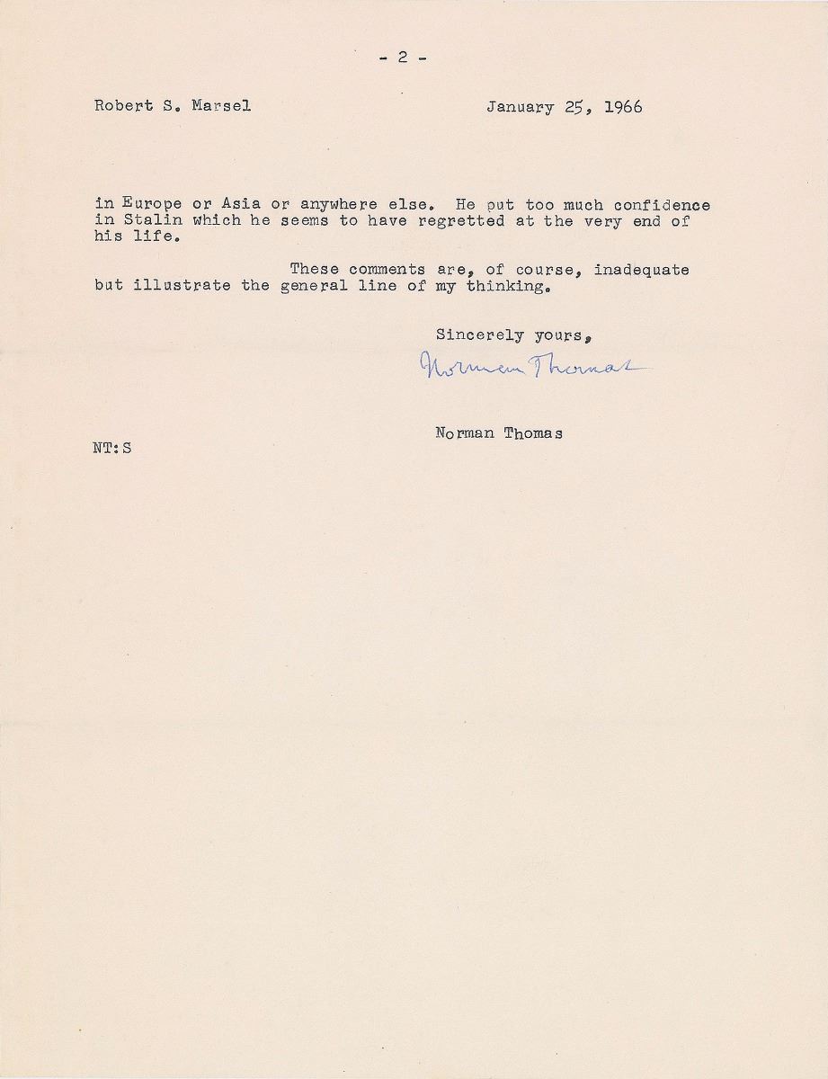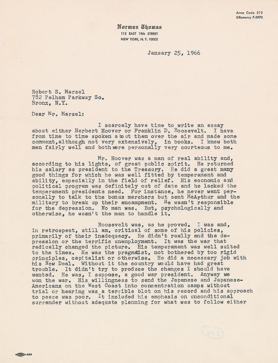 American Presbyterian minister (1884–1968) who was a six-time presidential candidate for the Socialist Party of America. TLS, two pages, 8.5 x 11, personal letterhead, January 25, 1966. Letter to Robert Marsel, concerning his appraisal of Herbert Hoover and Franklin D. Roosevelt, in part: “Mr. Hoover was a man of real ability and, according to his lights, of great public spirit. He returned his salary as president to the Treasury. He did a great many good things for which he was well fitted by temperament and ability, especially in the field of relief. His economic and political program was definitely out of date and he lacked the temperament presidents need. For instance, he never went personally to talk to the bonus marchers but sent McArthur [sic] and the military to break up their encampment. He wasn’t responsible for the depression. No man was. But, psychologically and otherwise, he wasn’t the man to handle it. Roosevelt was, as he proved. I was and, in retrospect, still am, critical of some of his policies, primarily of their inadequacy. He didn’t really end the depression or the terrific unemployment. It was the war that radically changed the picture. His temperament was well suited to the times. He was the pragmatist, not bothered by too rigid principles, capitalist or otherwise. He did a necessary job with his New Deal. Without it the country would have had great trouble. It didn’t try to produce the change I should have wanted. He was, I suppose, a good war president. Anyway we won the war. His willingness to send the Japanese and Japanese-Americans on the West Coast into concentration camps without trial or hearing was a terrible blot on his record and his approach to peace was poor. It included his emphasis on unconditional surrender without adequate planning for what was to follow either in Europe or Asia or anywhere else. He put too much confidence in Stalin which he seems to have regretted at the very end of his life.” In fine condition. Accompanied by the original mailing envelope. Ex. Walter R. Benjamin Autographs, April 5, 1995.