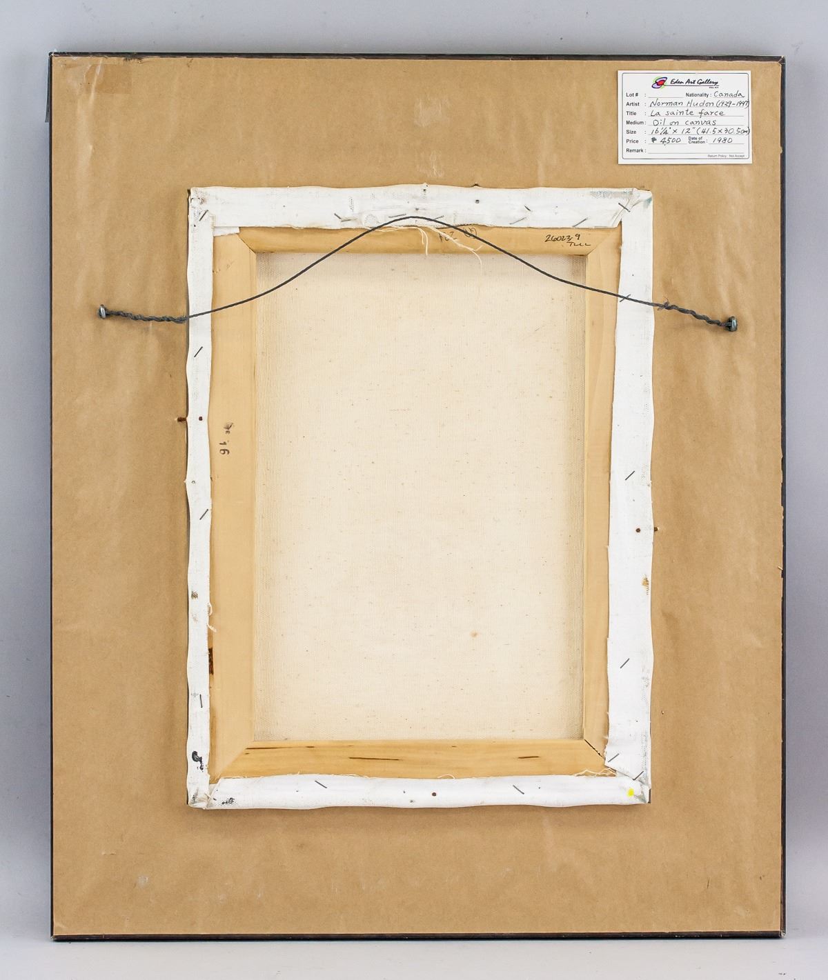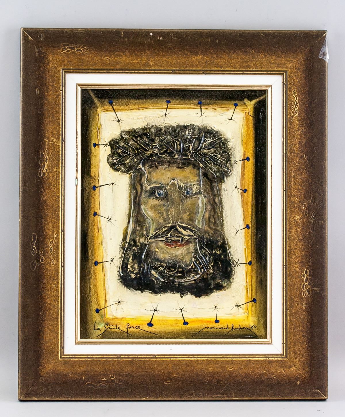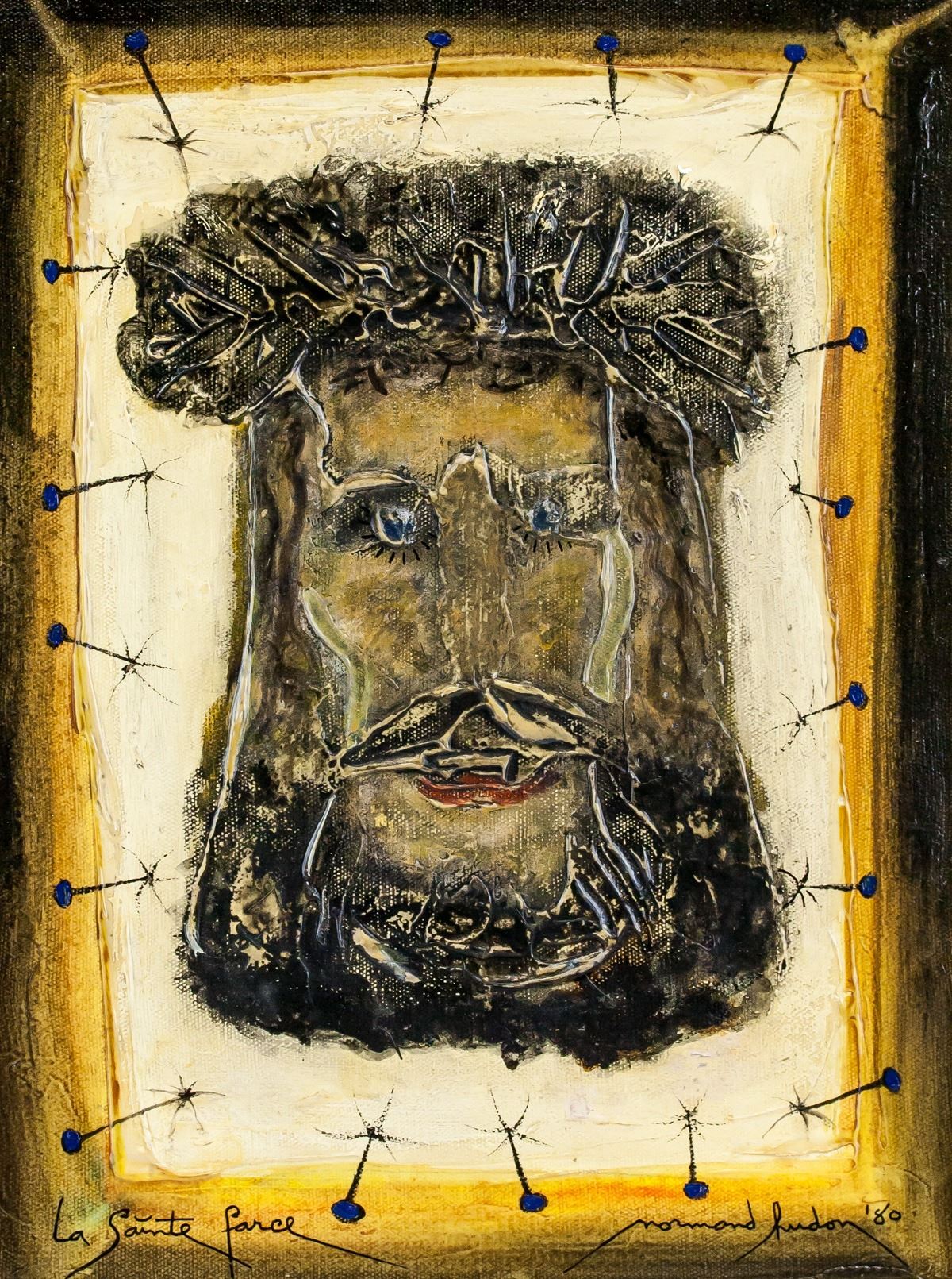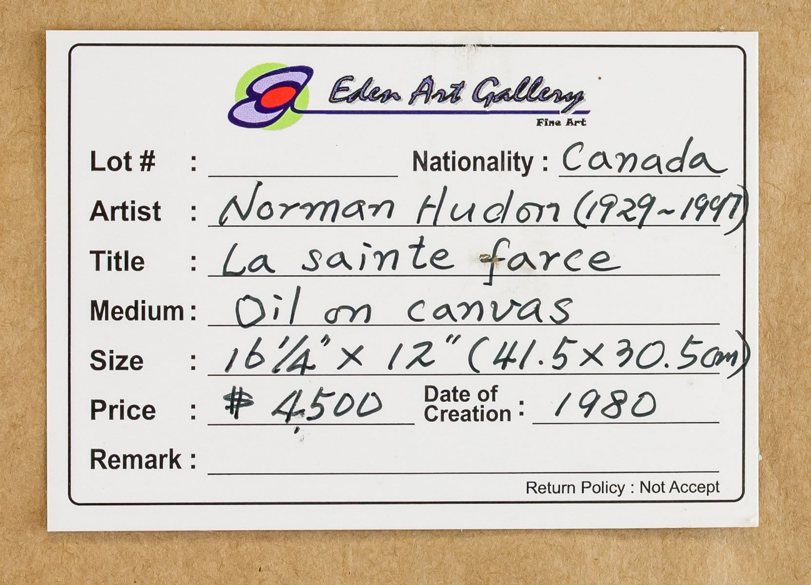 Oil on canvas, stretched and framed. Featuring portrait of man on a pincushion stuck with pins. Inscribed with La Sainte Farce in bottom left corner, and signed Normand Hudon '80 in the bottom right corner. Label affixed to verso reads "Eden Art Gallery, Fine Art, Lot # [blank], Nationality: Canada, Artist: Norman Hudon (1929-1997), Title: La Sainte Farce, Medium: Oil on canvas, Size: 16 1/4" x 12" (41.5 x 30.5 cm), Price: $4,500, Date of Creation: 1980, Remark: [blank]. Return Policy: Not Accept". Inscribed on verso 26023-9 TLLL. Attributed to Normand Hudon, 1929 - 1997. 41.5 x 30.5 cm (16.25 x 12 in), Frame: 59 x 49 cm (19.2 x 15.4 in). PROVENANCE: Eden Art Gallery