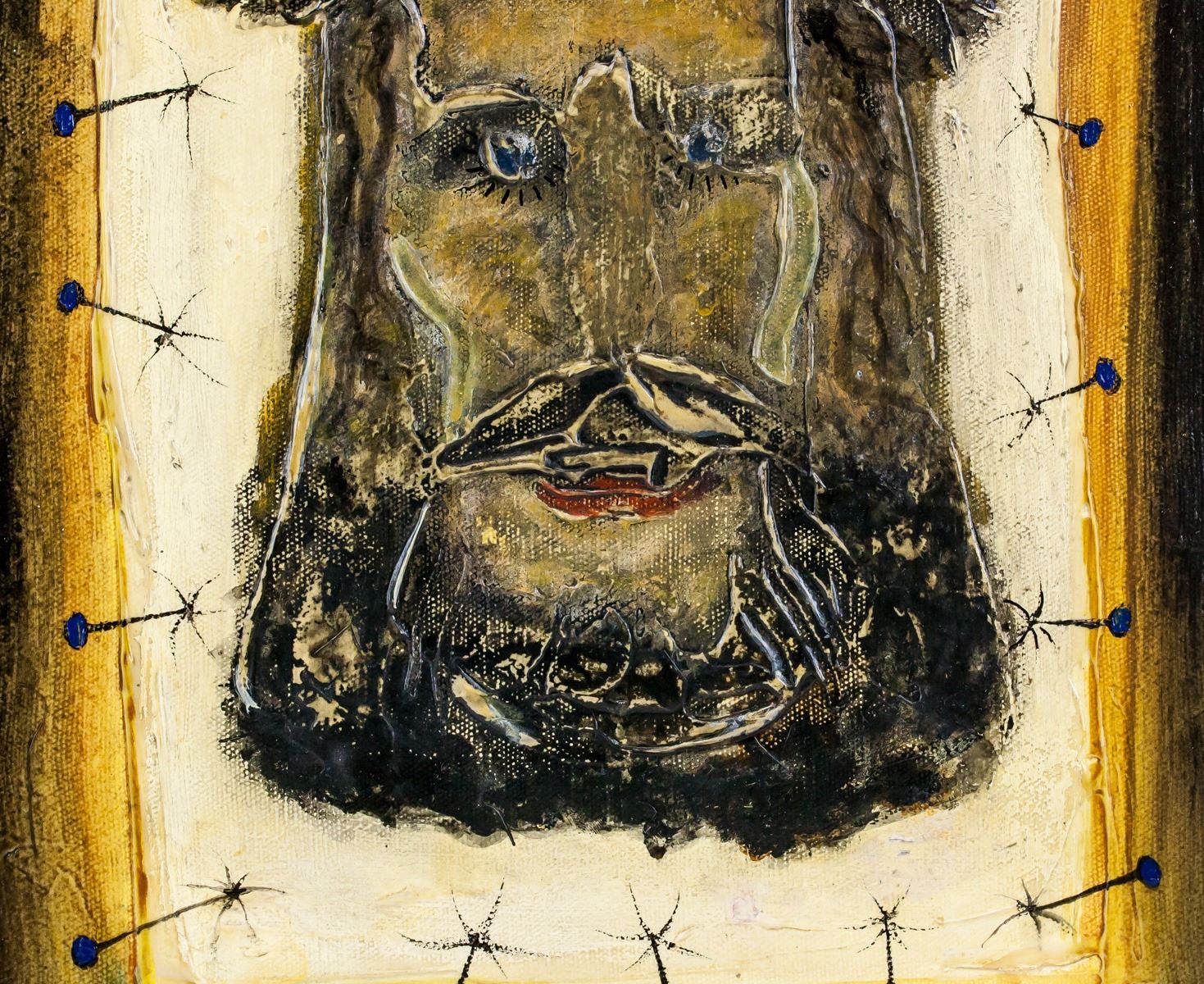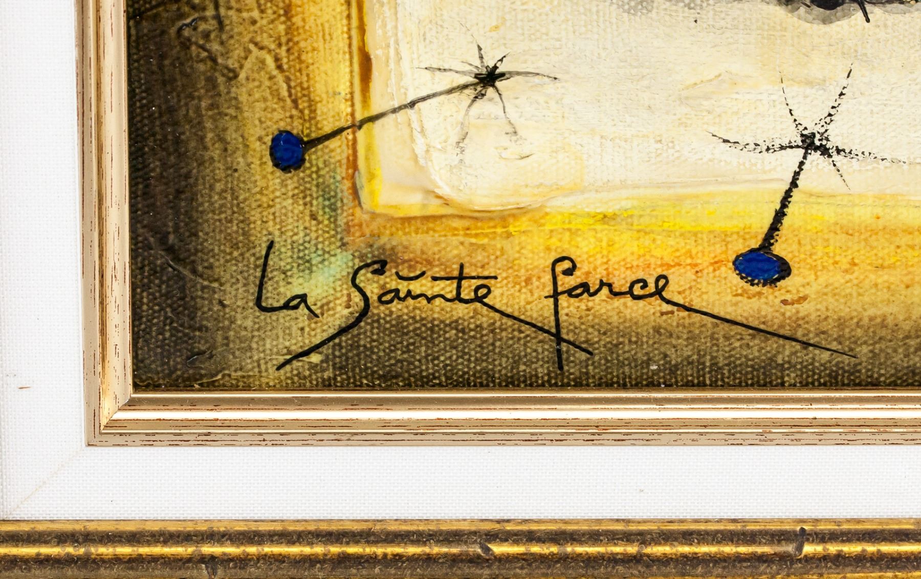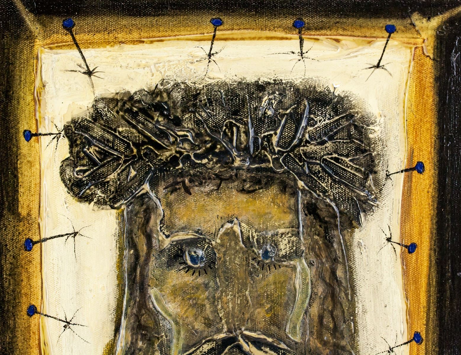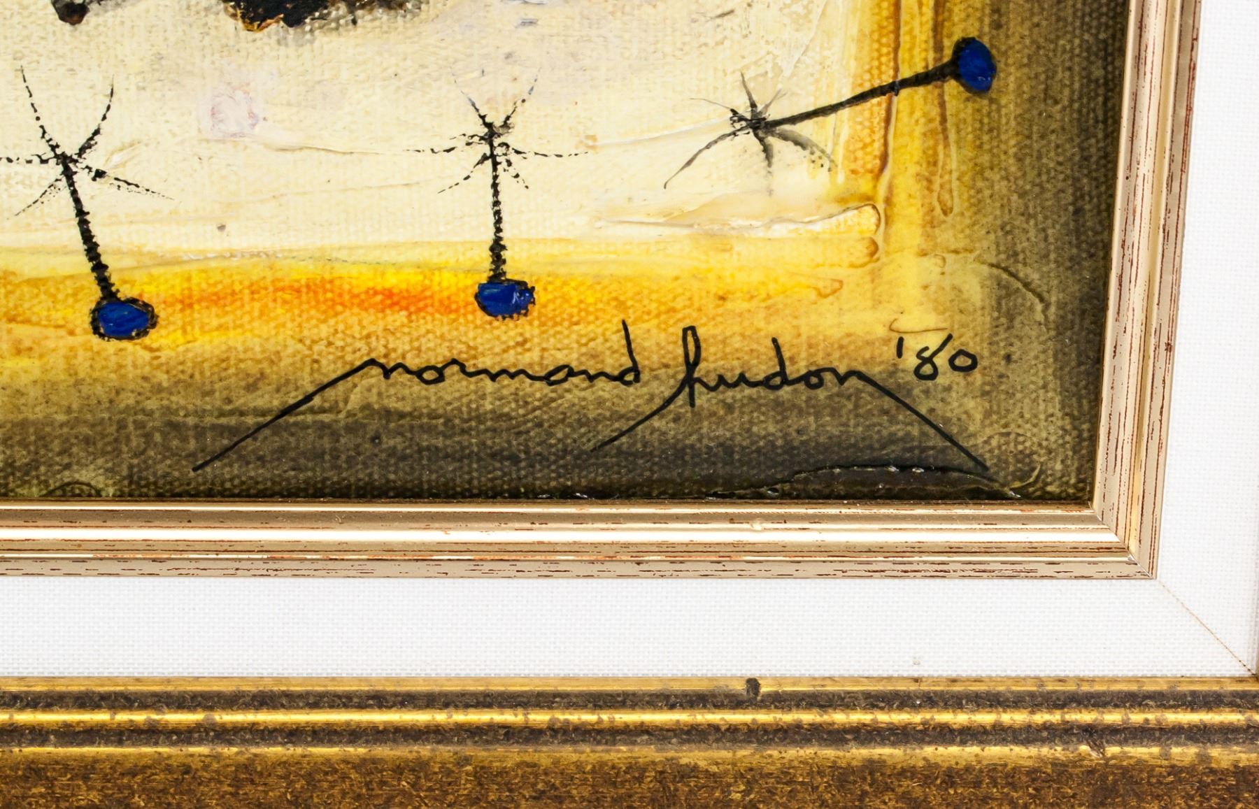 Oil on canvas, stretched and framed. Featuring portrait of man on a pincushion stuck with pins. Inscribed with La Sainte Farce in bottom left corner, and signed Normand Hudon '80 in the bottom right corner. Label affixed to verso reads "Eden Art Gallery, Fine Art, Lot # [blank], Nationality: Canada, Artist: Norman Hudon (1929-1997), Title: La Sainte Farce, Medium: Oil on canvas, Size: 16 1/4" x 12" (41.5 x 30.5 cm), Price: $4,500, Date of Creation: 1980, Remark: [blank]. Return Policy: Not Accept". Inscribed on verso 26023-9 TLLL. Attributed to Normand Hudon, 1929 - 1997. 41.5 x 30.5 cm (16.25 x 12 in), Frame: 59 x 49 cm (19.2 x 15.4 in). PROVENANCE: Eden Art Gallery