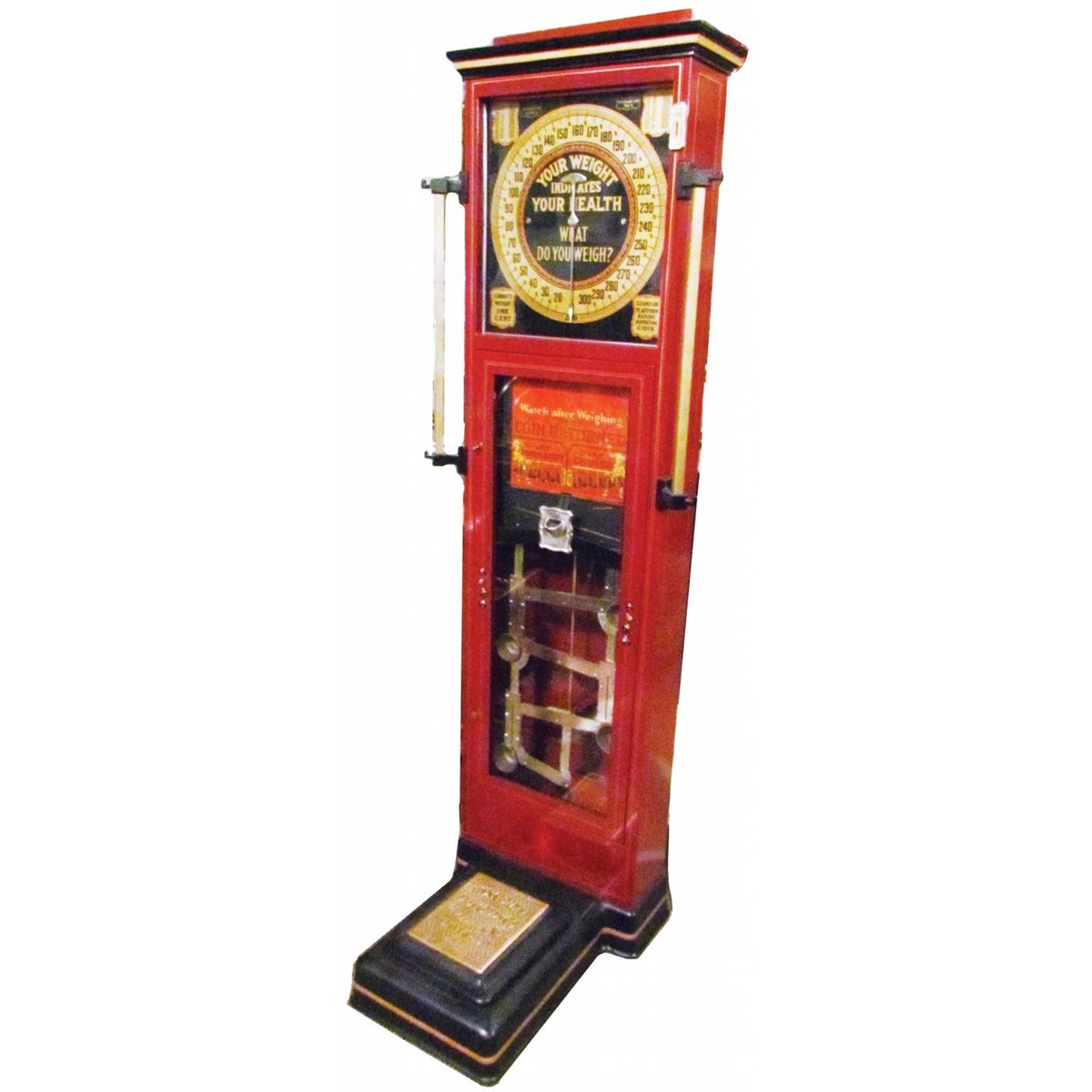 Normandy Chime Scale Model 170. 1929 by The National Automatic Machine Co. Minn. Probably the most sought after cabinet scale. Drop a penny and the chimes play, or randomly returns coin with gambling mechansim. Professionally restored, excellent working condition, comes with keys. 7 3 inches tall.