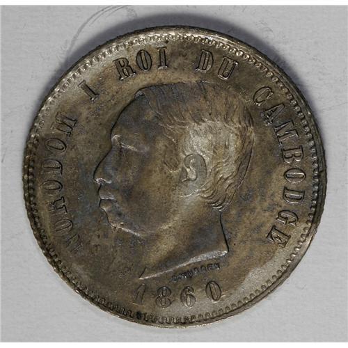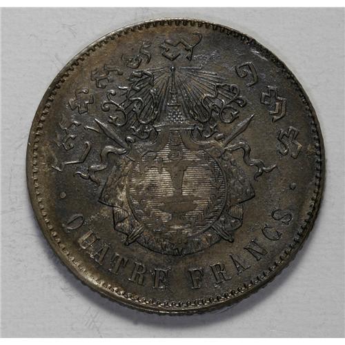 Norodom I 4 Francs 1860, KM48.2, toned AU-UNC, restrike