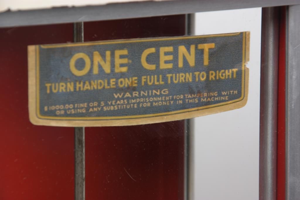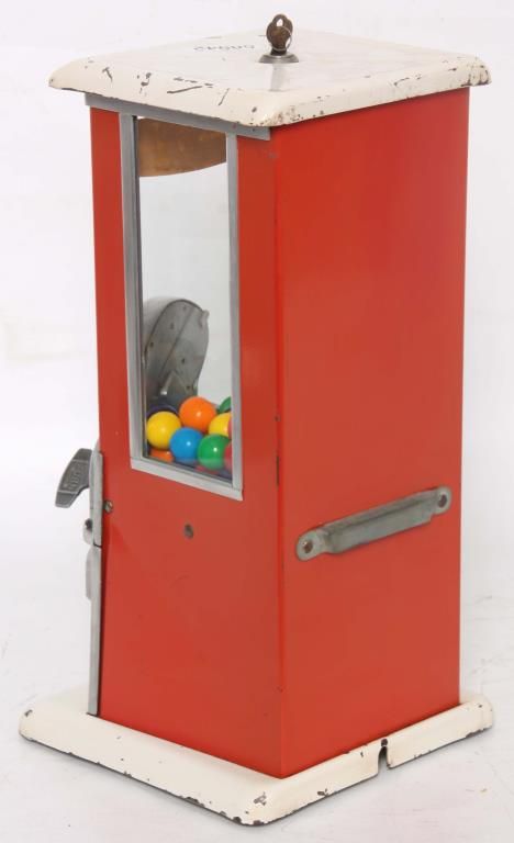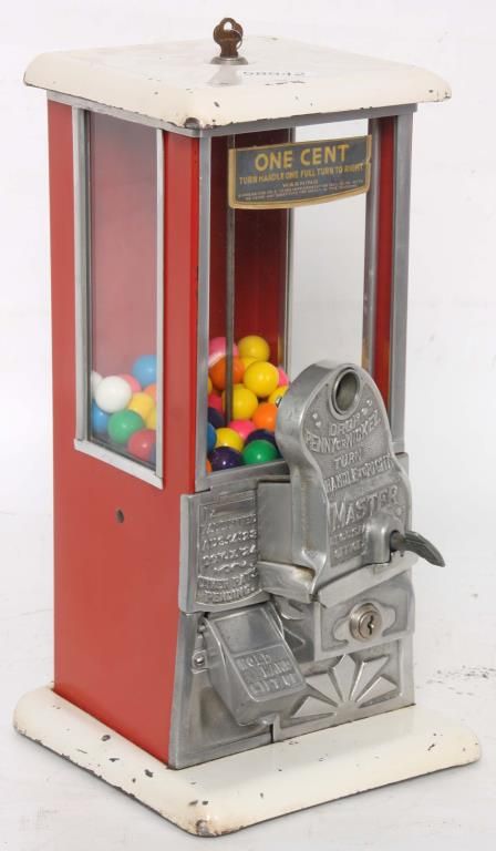Norris Master Gooseneck Gumball Machine. Nickel plated front with gooseneck coin entry, the key wind lever, reads “Drop Penny or Nickel” last patent date 1924; has a white painted top and base with red sides and back with glass panels. In nice working condition and has the key. 16 in. high x 8 in. wide x 8 in. deep.