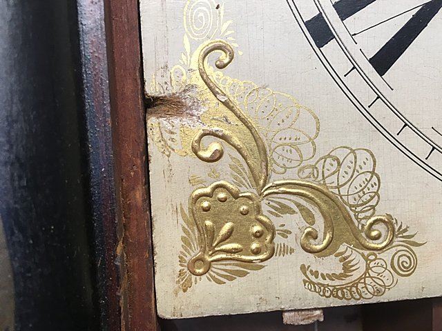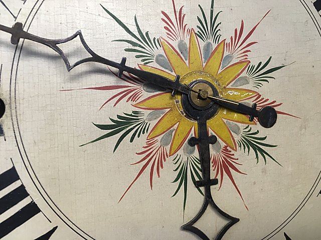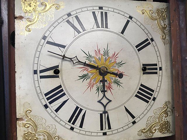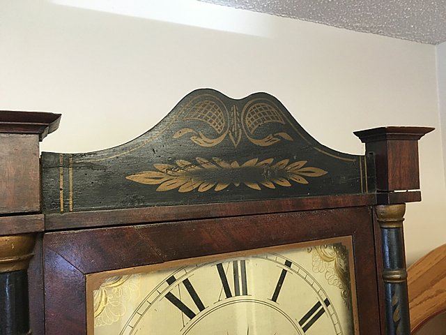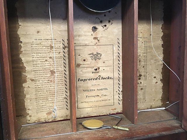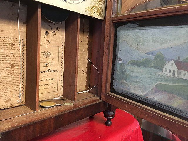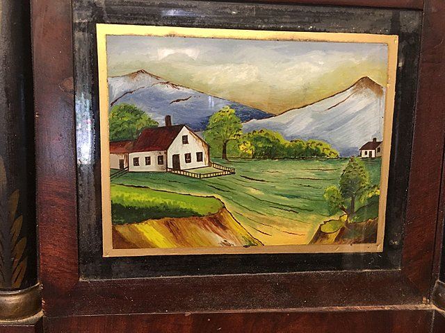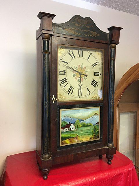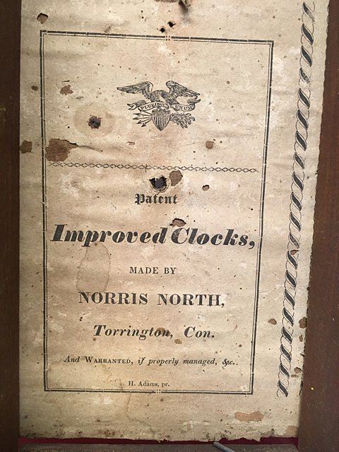 Norris North, Torrington, Conn, 30 hour wooden works, weight driven half column and splat shelf clock, with East/West movement, c. 1830. Stenciling on columns and splat, mahogany veneered case in original finish. Reverse painted tablet with country and mountain scene, beautiful original wood dial with hand painted flower design in middle, nice label, "Patent Improved Clocks, Made by Norris North, Torrington, Con. Measures approx. 28" high x 15 1/4" wide x 5" deep.