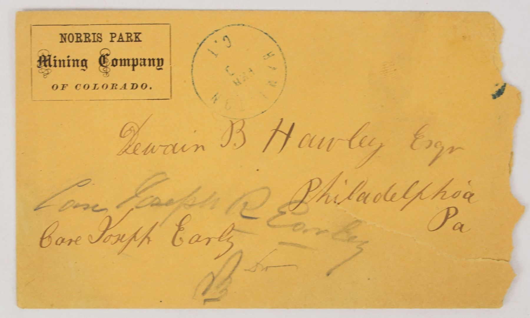 Hamilton, Colorado Territory cover with Norris Minig company of Colorado corner advertising. Ochre color cover, rag right, no stamp, addressed to Philadelphia. DPO 1860-1881.
