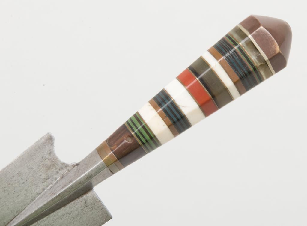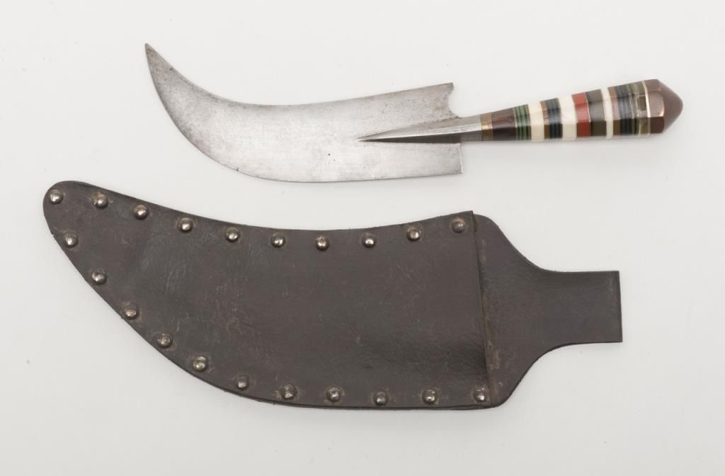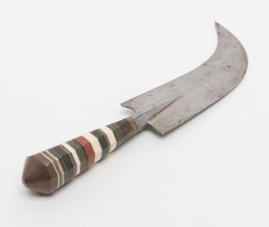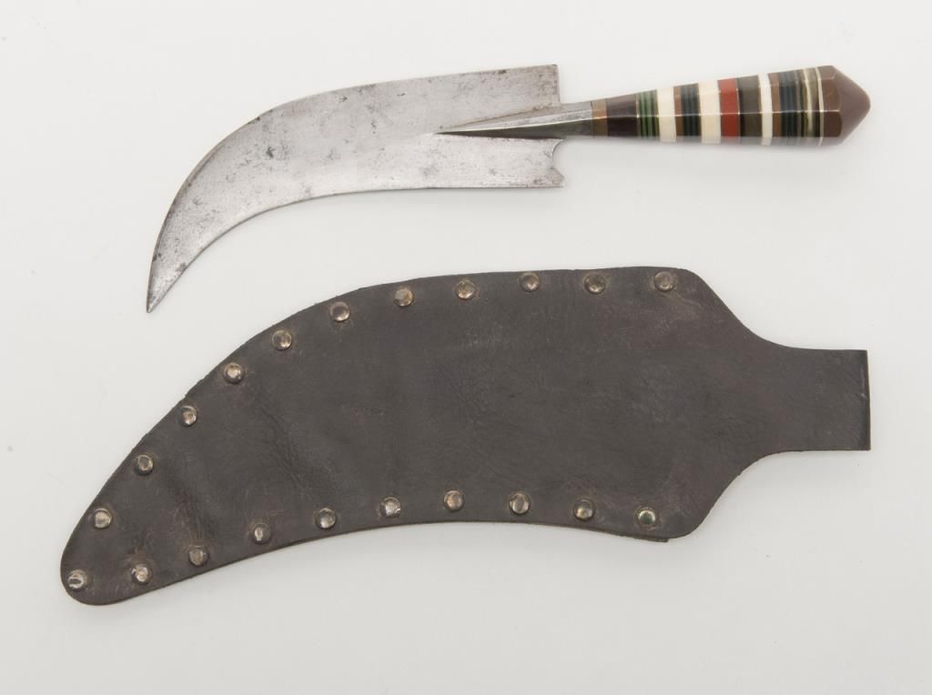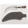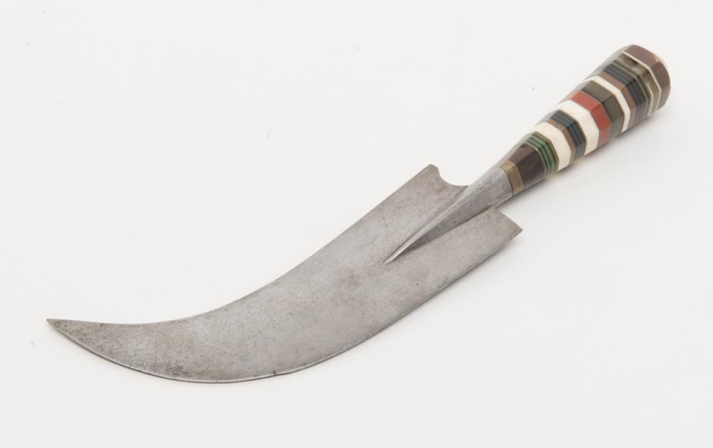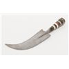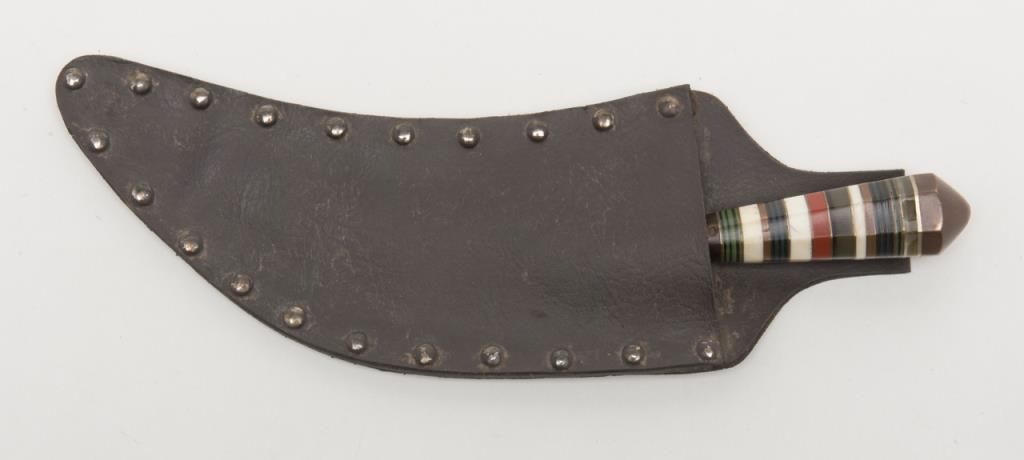 North Africa to Morocco style curved dagger with graduated hilt showing various colored bone pieces and composite materials layered to form grip. The blade is in good condition and the scabbard associated later. Est.: $100-$300