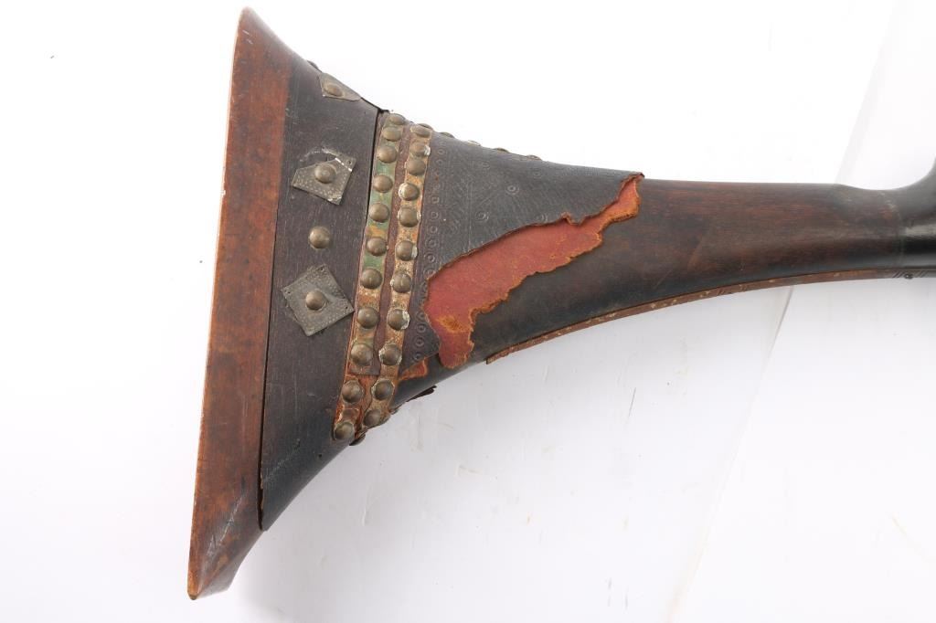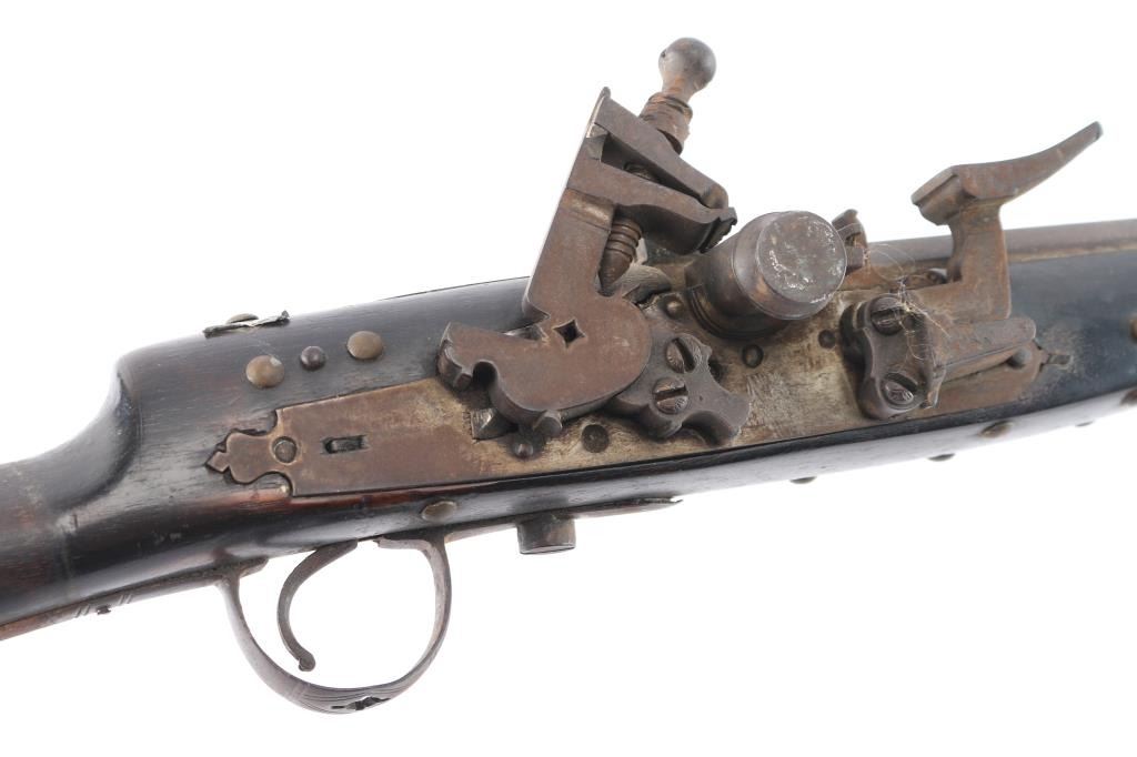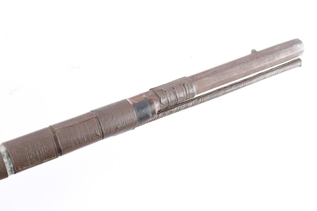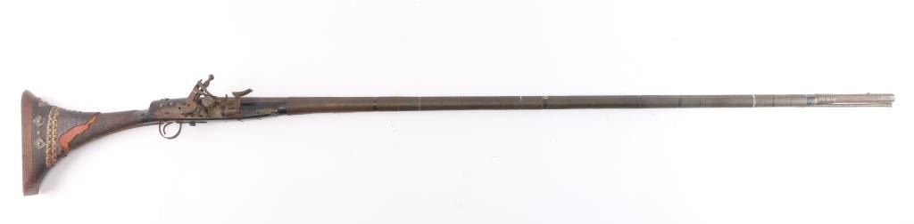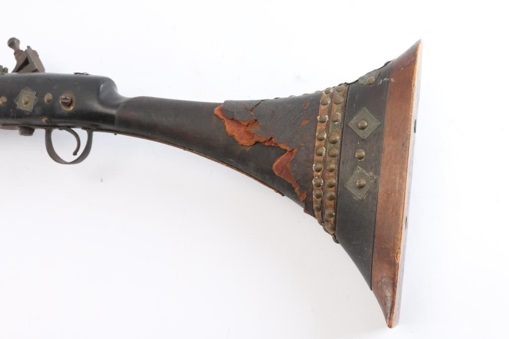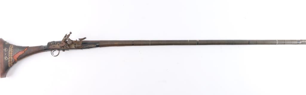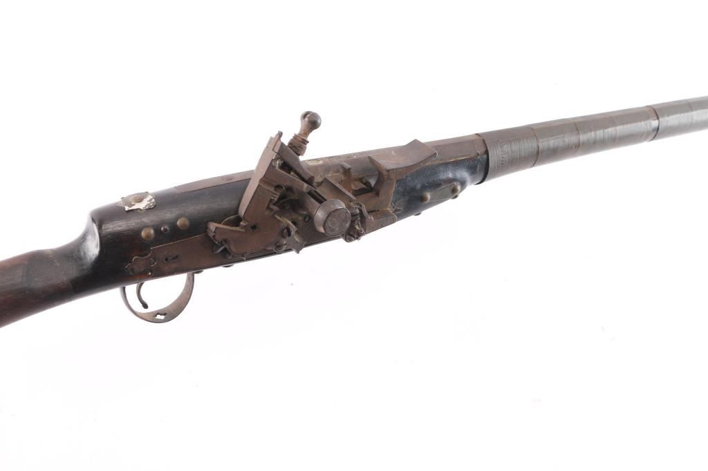 North African/ Moroccan Miquelet Lock Jezail Musket, circa late 1700’s. 71 3/4 o/a length with 56 3/4” octagon approx. .45 smoothbore barrel with maker cartouches at breech and the original front and rear sights barrel has 27 thin metal bands. "Club Foot" butt with large flared butt plate. Brass barrel bands. All original. Nice old metal patina. Stock with the old dark original finish. Two-cock lock does not hold, has all the original lock parts. Original metal tipped ramrod. Most of the black leather covering the butt stock is gone.