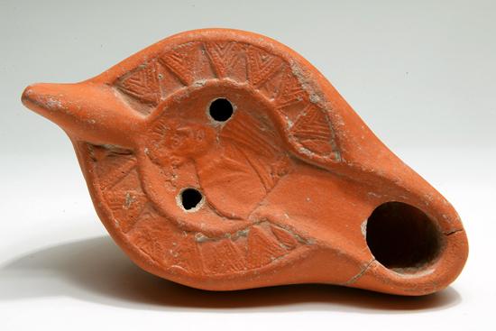 North African Red-Ware Oil Lamp, circa 4th-5th century A.D. Featured in the discus is a Roman male wearing a toga flanked by two filling holes. Intact. Length: 6".
