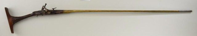 North African miquelet Flintlock Musket type carried by nomadic chieftains’, circa 19th century. The musket measures 74” overall with 58” barrel of 60 cal smooth bore, butt plate measuring 11” across back. The barrelis wrapped in hammered brass and lock and breech show engraving with traces of old silver applied decoration. The stock is inlaid with brass tacks and red dyed stones. The condition is fair to good. The slidingpin has detached and screw is missing otherwise fair to good overall. From an old N.Y. collector’s estate. Est.;$350-$700.