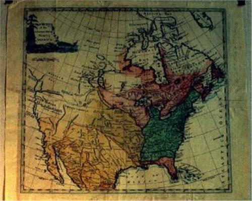 North America. "A New and Accurate Map of North America," printed in London, 177579. Decorative border, 14 x 16 -1/2 . Showing Canada and "Hudson's Bay," identifying colonies of New England, and down to "East and West Florida." From Atlantic to Pacific, shows "New Albion" (northern California), and a huge area designated "New Mexico." Charming cartouche of river scene at upper left. Several small tape mends on verso at margin, one extending -1/2 " into map area. Map itself very fine, beautifully hand-colored, and outstanding for display.