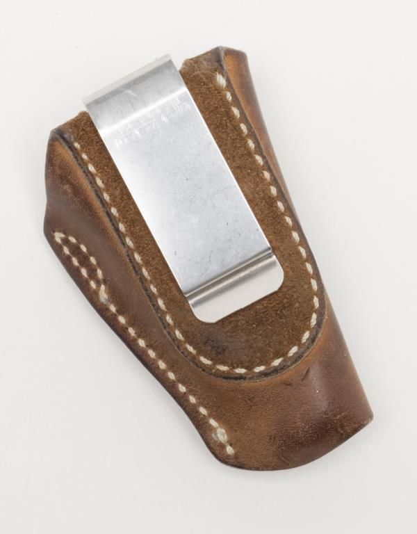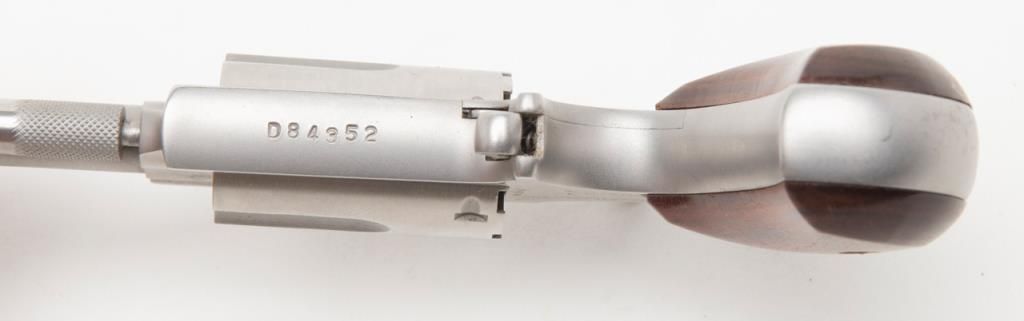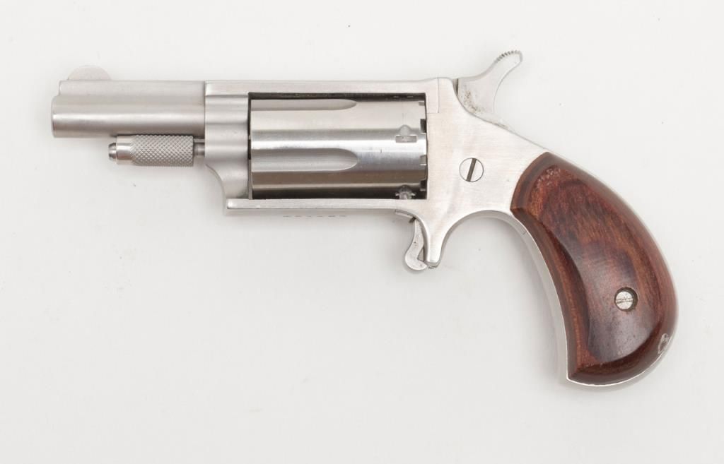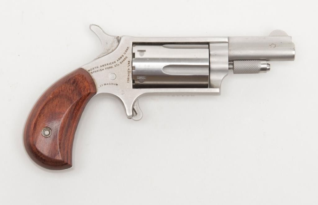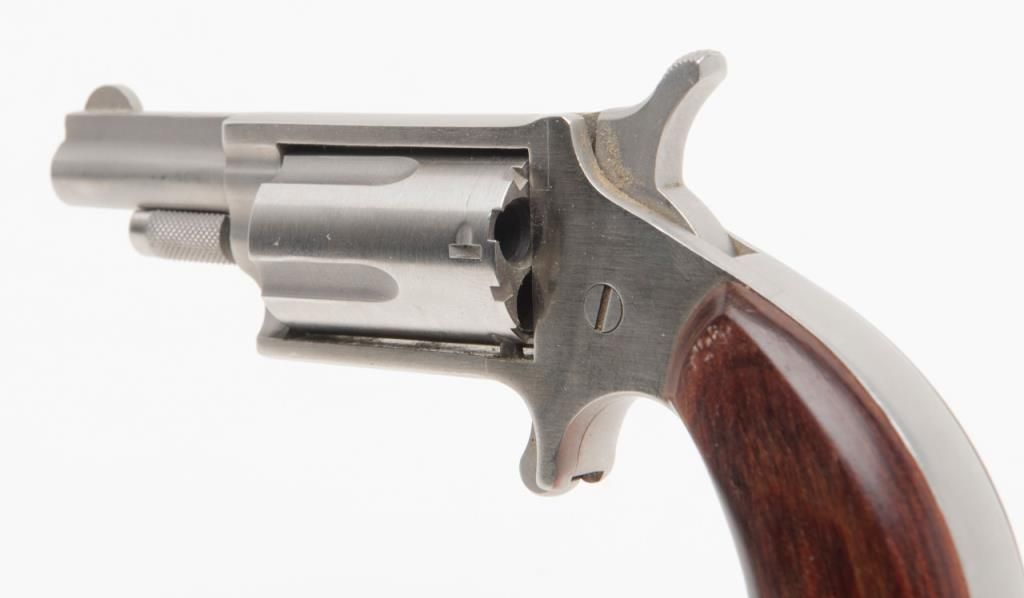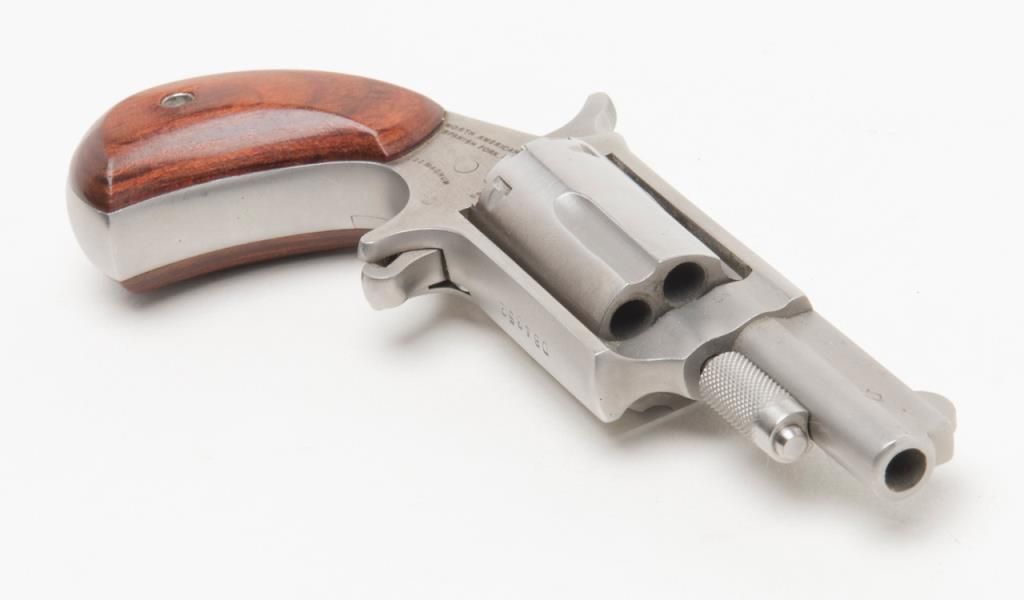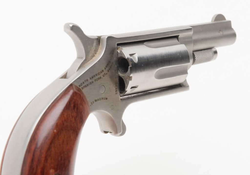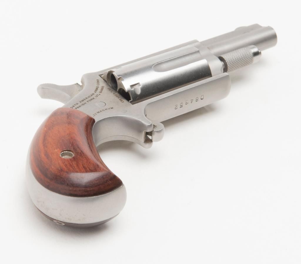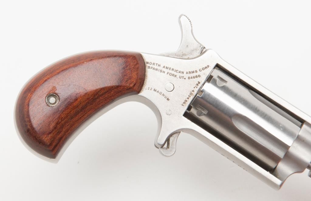 North American Arms Corp. mini spur trigger derringer, .22 Magnum cal., 1-5/8” barrel, stainless steel, wood grips, #D84352 in overall fine condition showing little use with leather clip on holster. (Modern/PPT). Est.:$150-$300.
