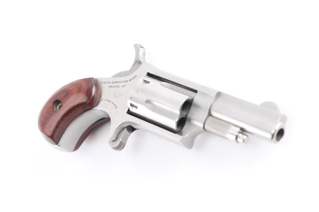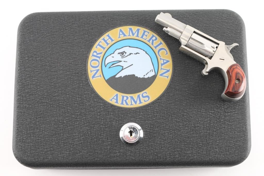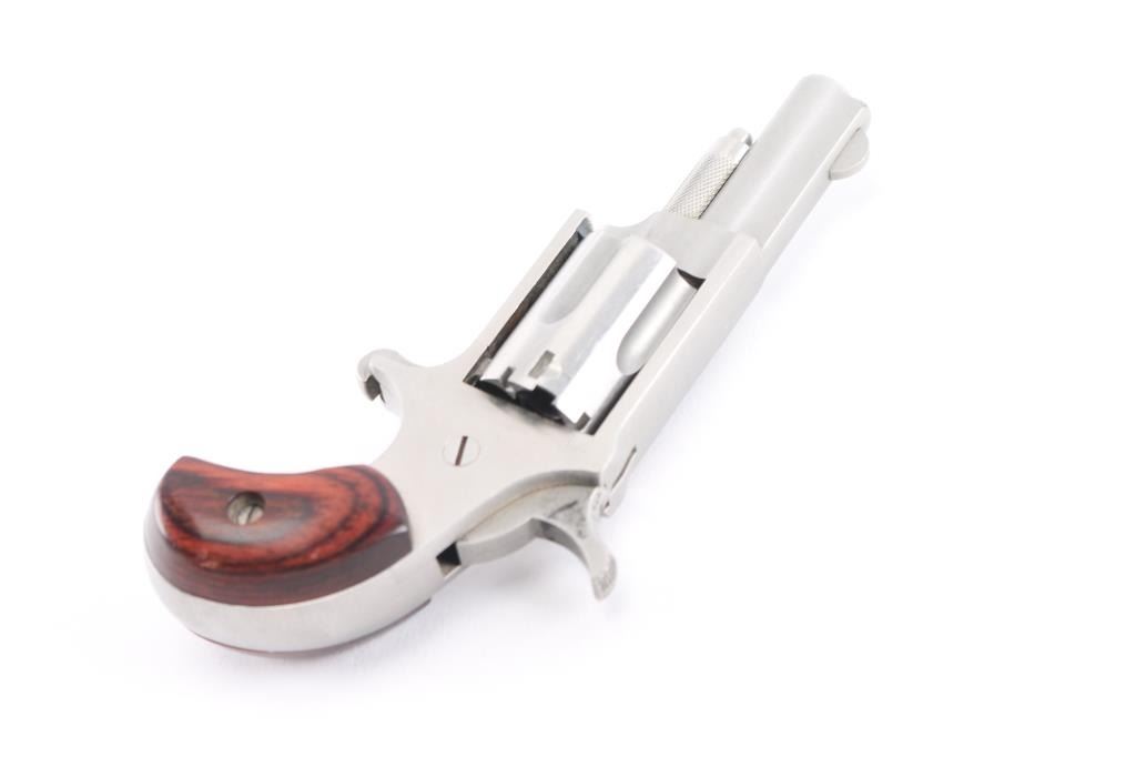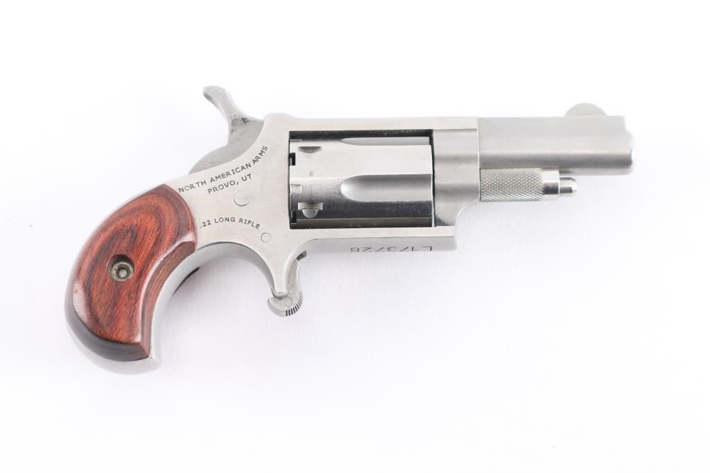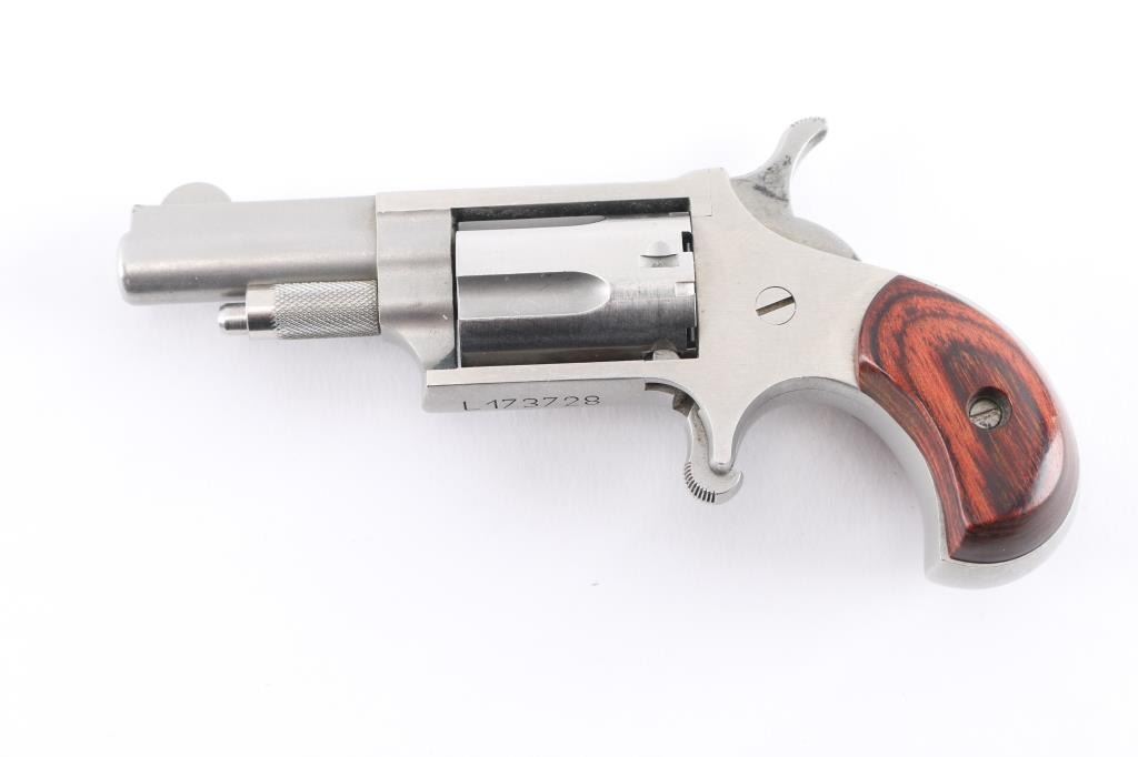 SN: L173728 Single action mini revolver. Features stainless steel construction, 1.625" barrel, 5 shot fluted cylinder, spur trigger, smooth rosewood grips. Bore is very good condition, needs cleaning. Finish is very good, showing handling marks. In original factory locking security box with keys & paperwork, small belt pouch holster.