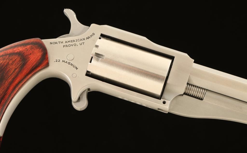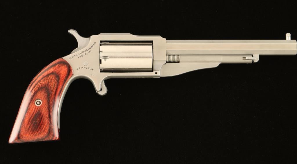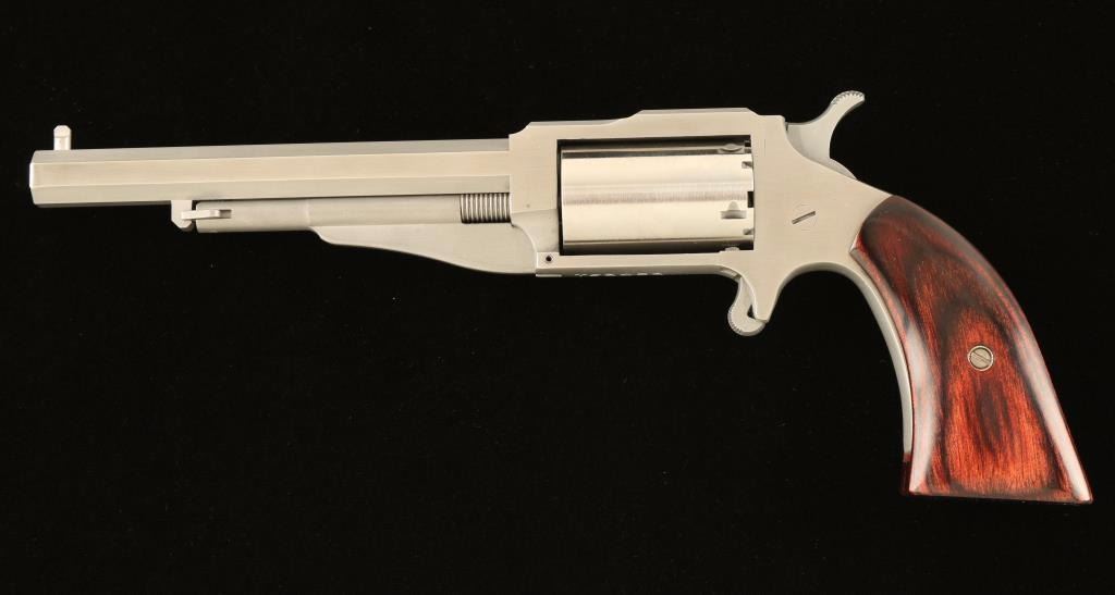 Miniature stainless steel single action revolver chambered in .22 Magnum, stylized after the 1860 Remington. Features a brushed & matte finish, 4" octagonal barrel, pinched post front sight, notched rear sight, non-fluted five shot cylinder, serrated hammer spur, faux loading lever, serrated spur trigger and two piece smooth rosewood grips. Includes the original factory hard case with documents and lock. Revolver shows little to no wear. Action is smooth, bore is good and wood grips are excellent. Condition is excellent in case. ***Modern Firearm***