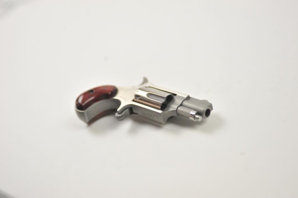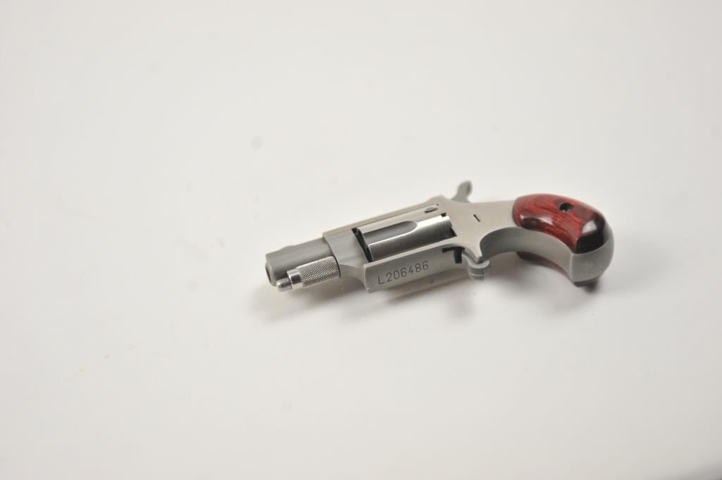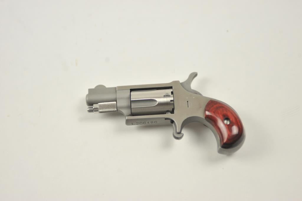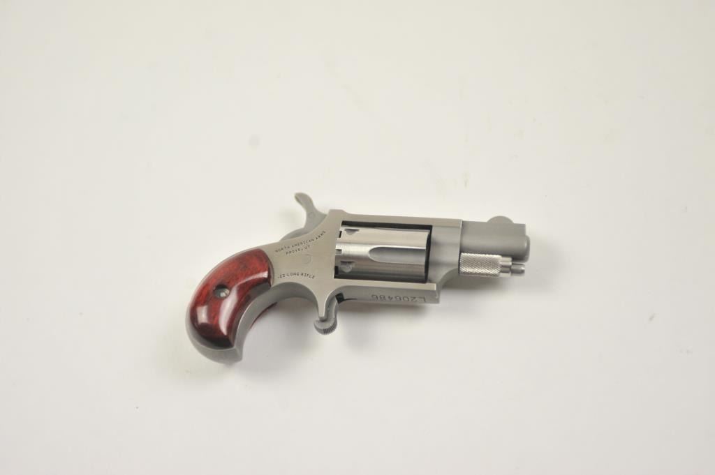 North American Arms mini revolver, .22 Long Rifle caliber, Serial #L206486. The pistol is in as new condition with a 1 ¼” barrel. The pistol retains approximately 99% of the stainless steel finish with light handlingmarks. The smooth wood grips are in excellent condition. The bore is very good and the action works well. Est.: $200-$400. (Modern/PPT).