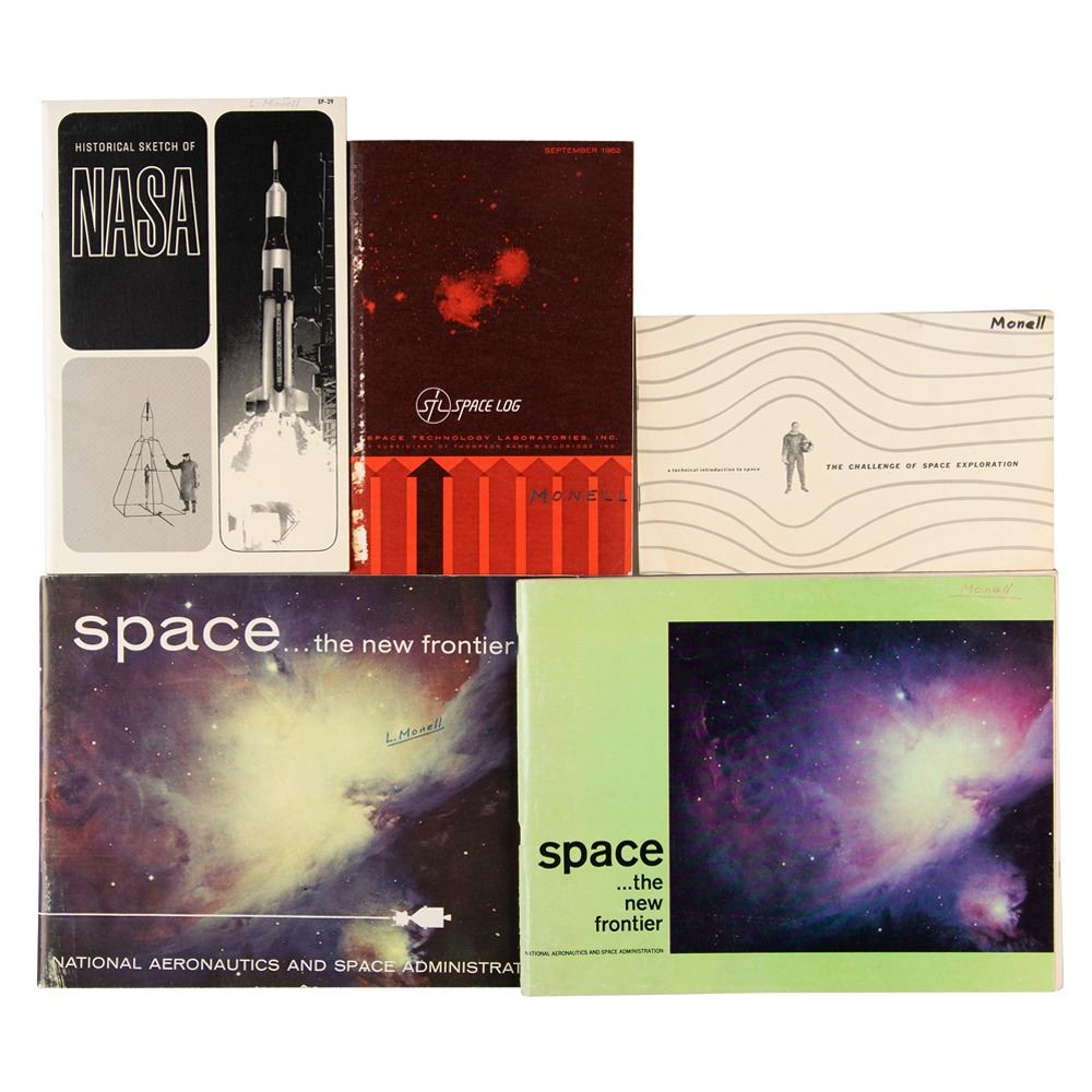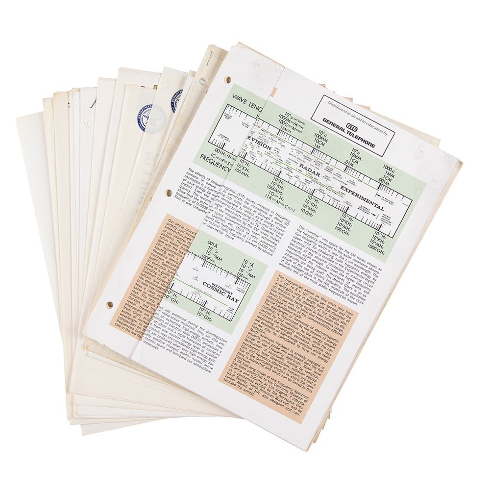 Papers pertaining to the frequency spectrum from the collection of Luther Monell, a senior engineer for Saturn S-II test and operation at North American Aviation. Includes his 14-page report on the frequency spectrum, offering an accessible discussion of electromagnetic waves; two copies of a fold-out "Frequency Spectrum" chart that he developed; a handwritten list of the frequencies used by the Apollo Saturn V for reception and transmission; two glossy 10 x 8 photos of Monell with a frequency spectrum exhibition that he built at the California Museum of Science & Technology; several pages of correspondence from people at noteworthy organizations—including the Defense Intelligence Agency, RCA, General Electric, General Dynamics, Allen-Bradley, Aerojet-General, Sanders, Bendix, Emerson, TRW, and Raytheon—most asking for copies of his frequency spectrum chart; and five space-related booklets. In overall fine condition.