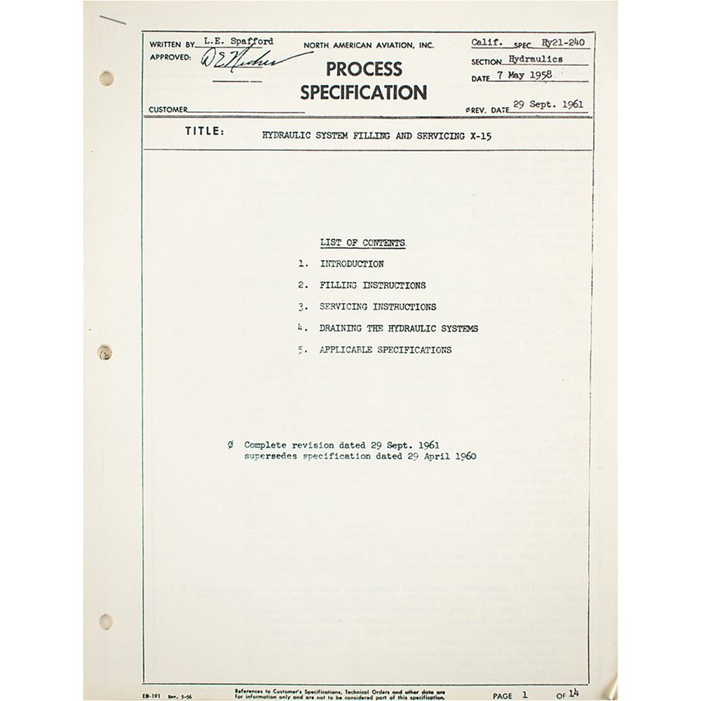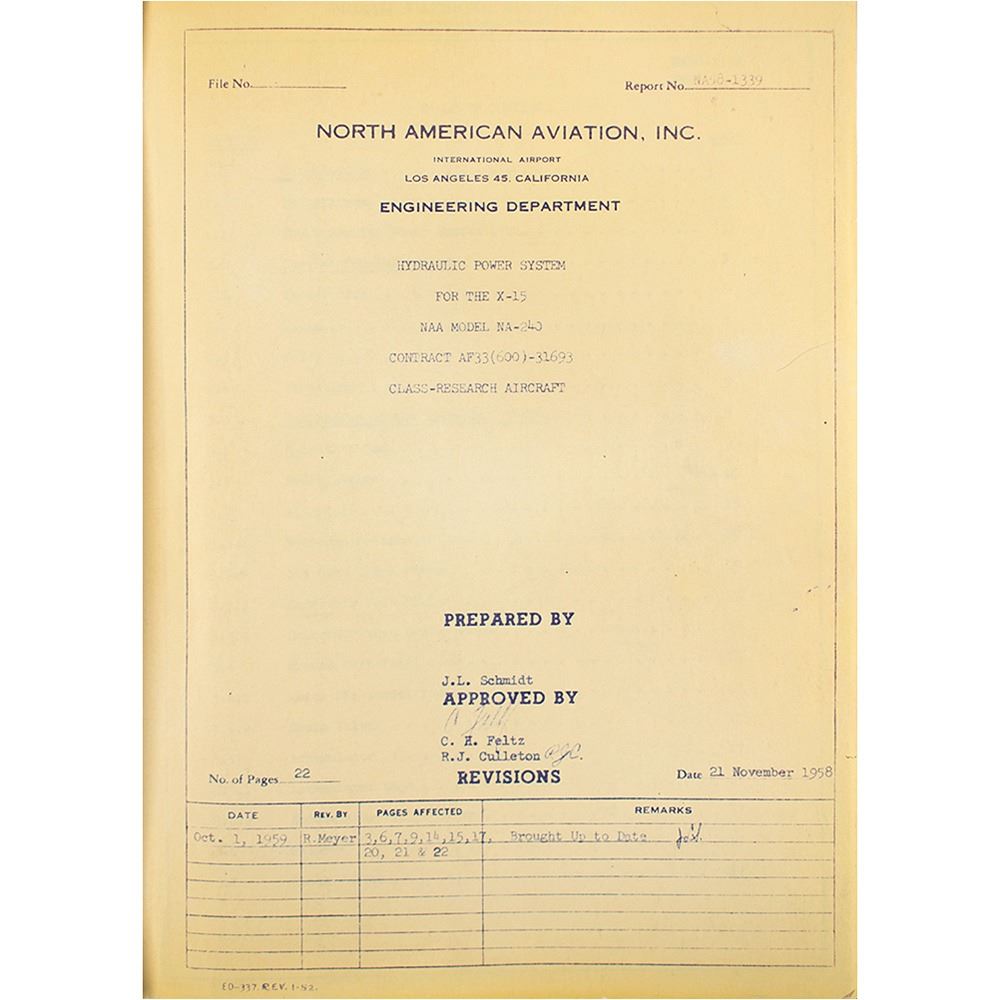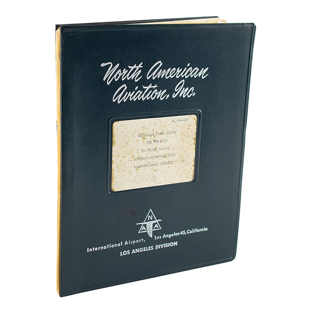 Uncommon report entitled "Hydraulic Power System for the X-15, NAA Model NA-240, Contract AF33(600)-31693, Class-Research Aircraft, Report No. NA58-1339," in its original North American Aviation, Inc. portfolio, 20 pages, 9 x 11.25, dated November 21, 1958. The report presents information of a design nature concerning the requirements of the X-15 airframe's hydraulic power system, and features a number of fold-out schematics, diagrams, charts, and tables. Laid in are original copies of a 14-page process specification document for the filling and servicing of the X-15 hydraulic system (rev. date September 29, 1961), and a four-page "trip report" memorandum regarding the construction and operation of the X-15 main hydraulic pump (July 3, 1963). In very good to fine condition, with staining to the title label on the front of the portfolio. A desirable, early X-15 report that pre-dates the rocket plane's first flight in June 1959.