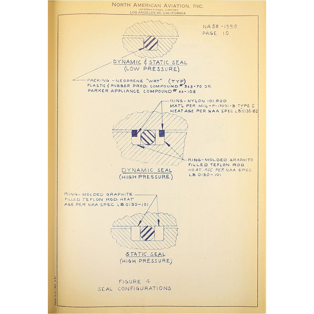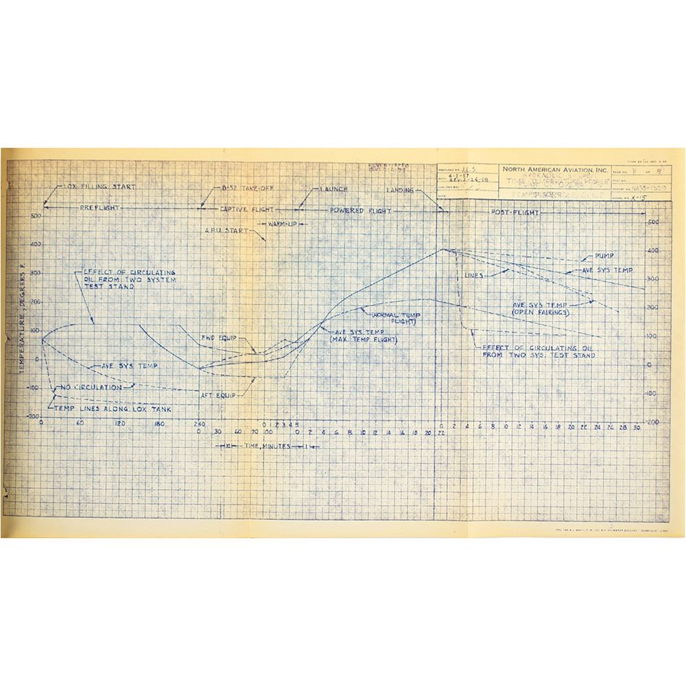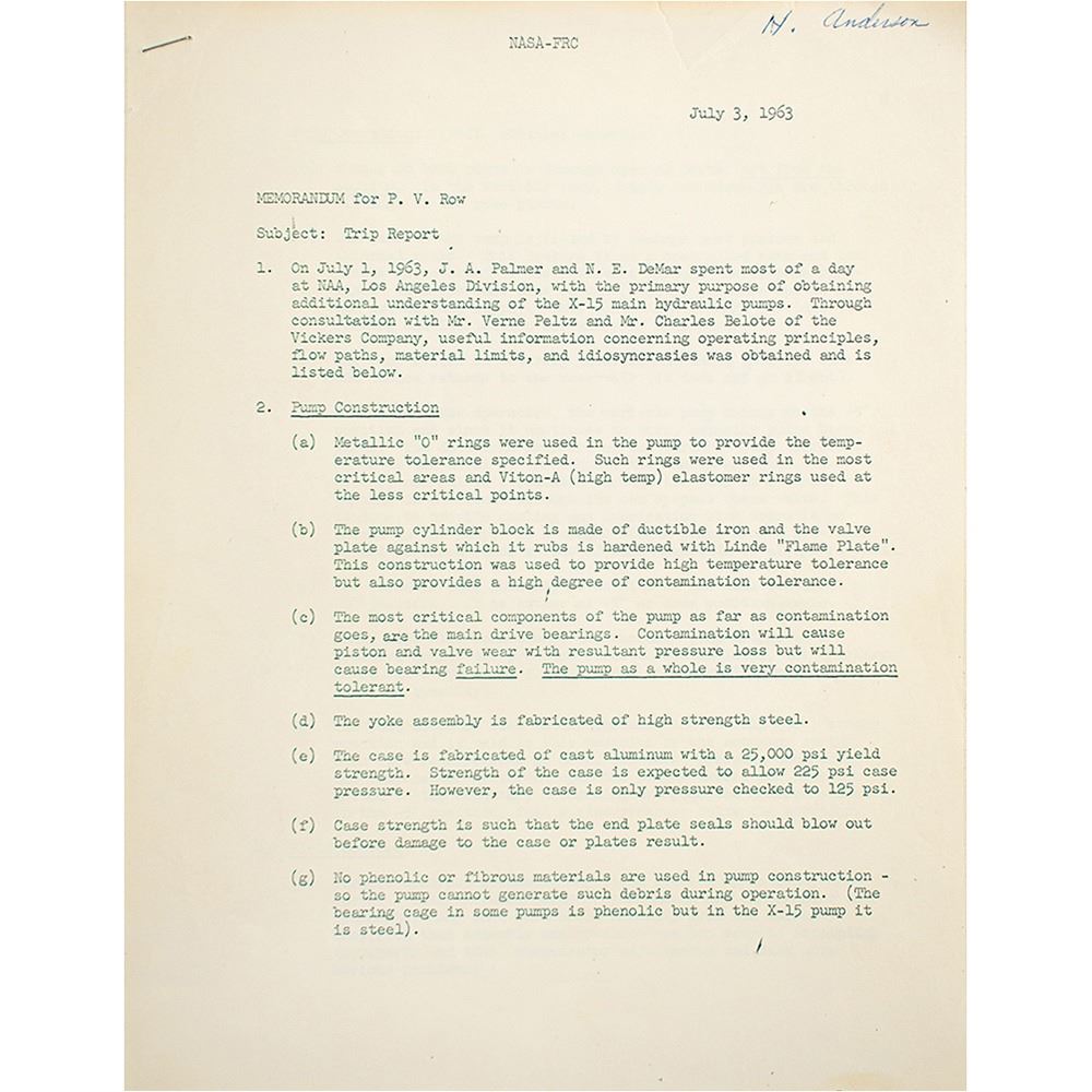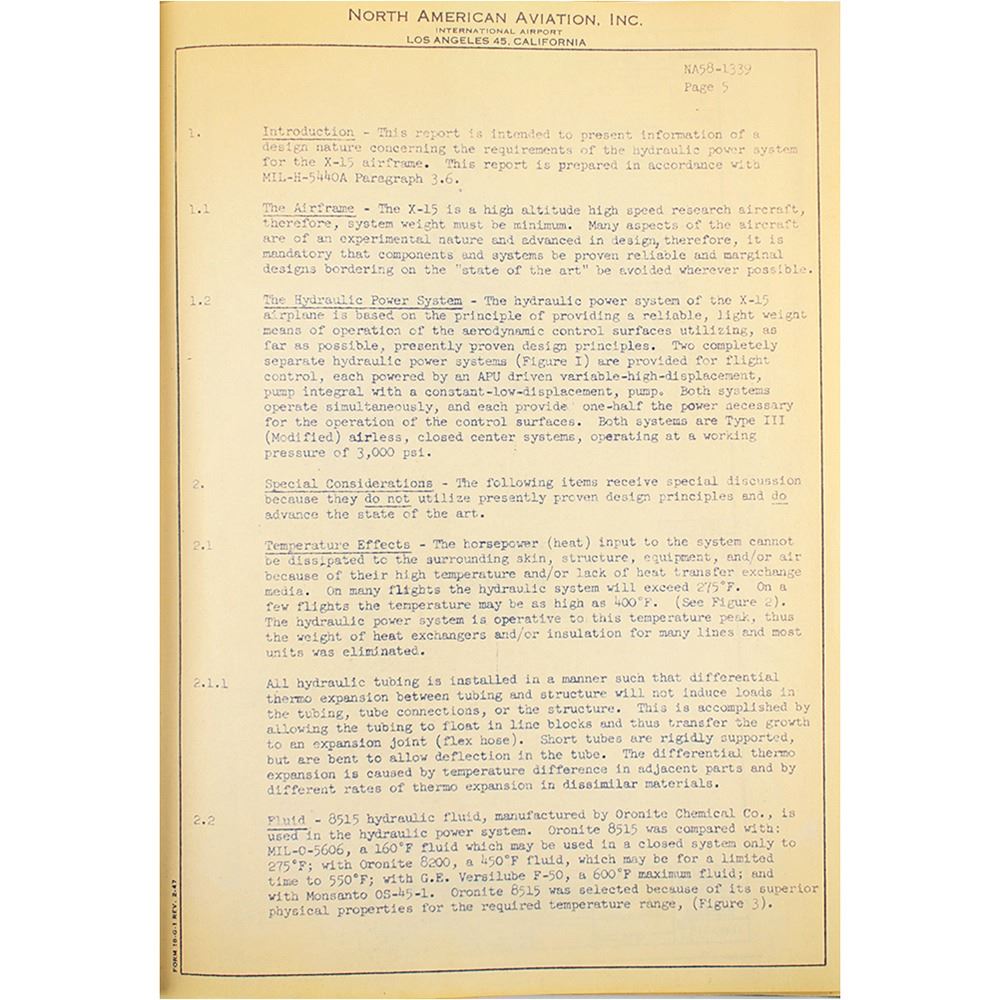Uncommon report entitled "Hydraulic Power System for the X-15, NAA Model NA-240, Contract AF33(600)-31693, Class-Research Aircraft, Report No. NA58-1339," in its original North American Aviation, Inc. portfolio, 20 pages, 9 x 11.25, dated November 21, 1958. The report presents information of a design nature concerning the requirements of the X-15 airframe's hydraulic power system, and features a number of fold-out schematics, diagrams, charts, and tables. Laid in are original copies of a 14-page process specification document for the filling and servicing of the X-15 hydraulic system (rev. date September 29, 1961), and a four-page "trip report" memorandum regarding the construction and operation of the X-15 main hydraulic pump (July 3, 1963). In very good to fine condition, with staining to the title label on the front of the portfolio. A desirable, early X-15 report that pre-dates the rocket plane's first flight in June 1959.