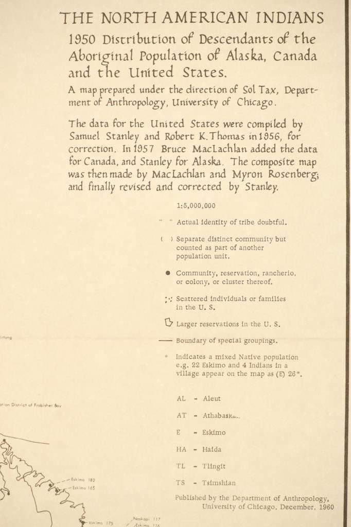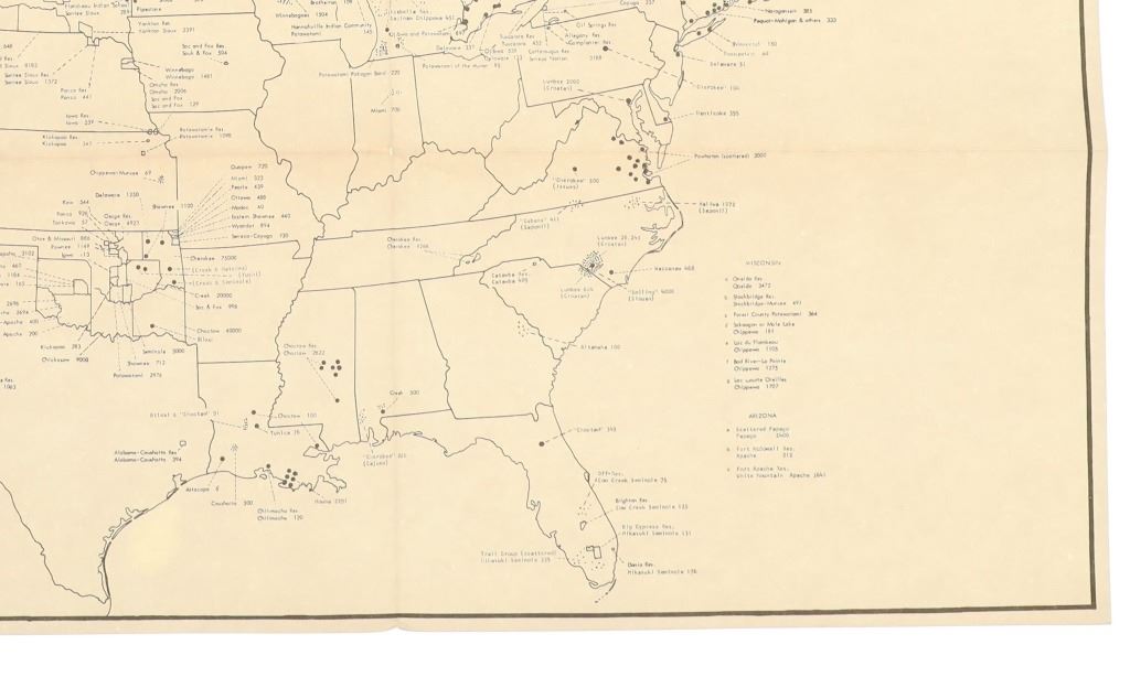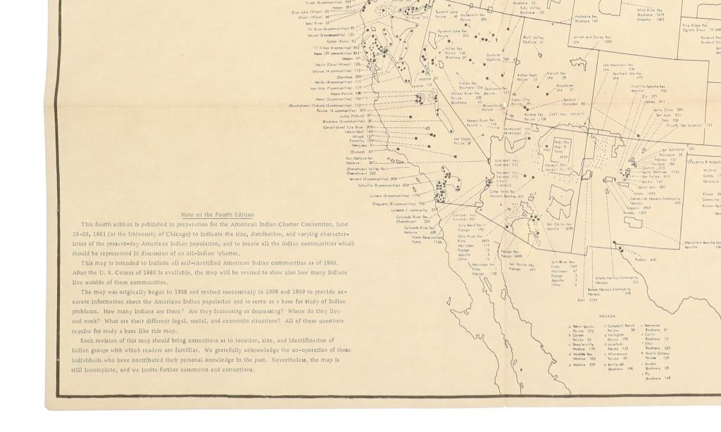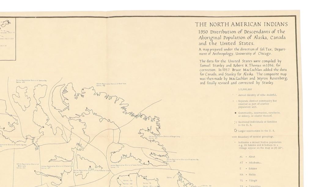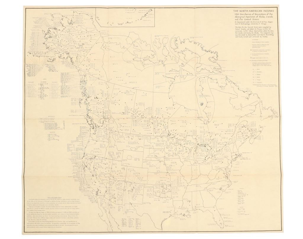 Featured in this lot is this North American Indian Distribution map circa 1950. The map features a wonderfully and professionally crafted paper construction that shows the network of Reservations throughout North America and Canada; this is a fourth edition and is a map of the 1950 distribution of descendants of the Aboriginal population of Alaska, Canada and the United States. The condition of this of this Distribution of Native Descendants map is good with no obvious signs of damage and shows good overall condition. The measurements of this map is 19" x 21 3/4".