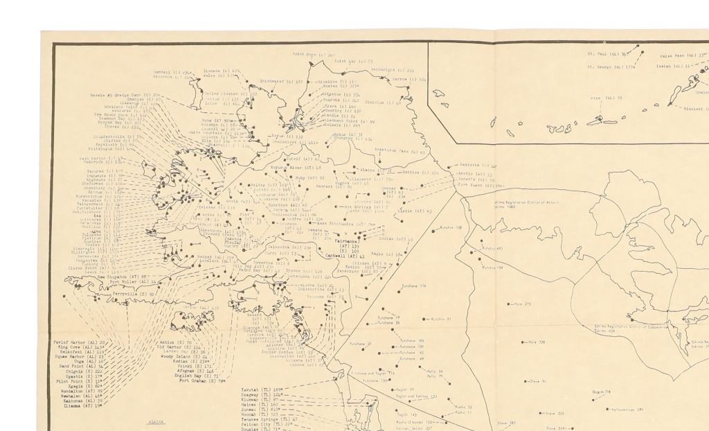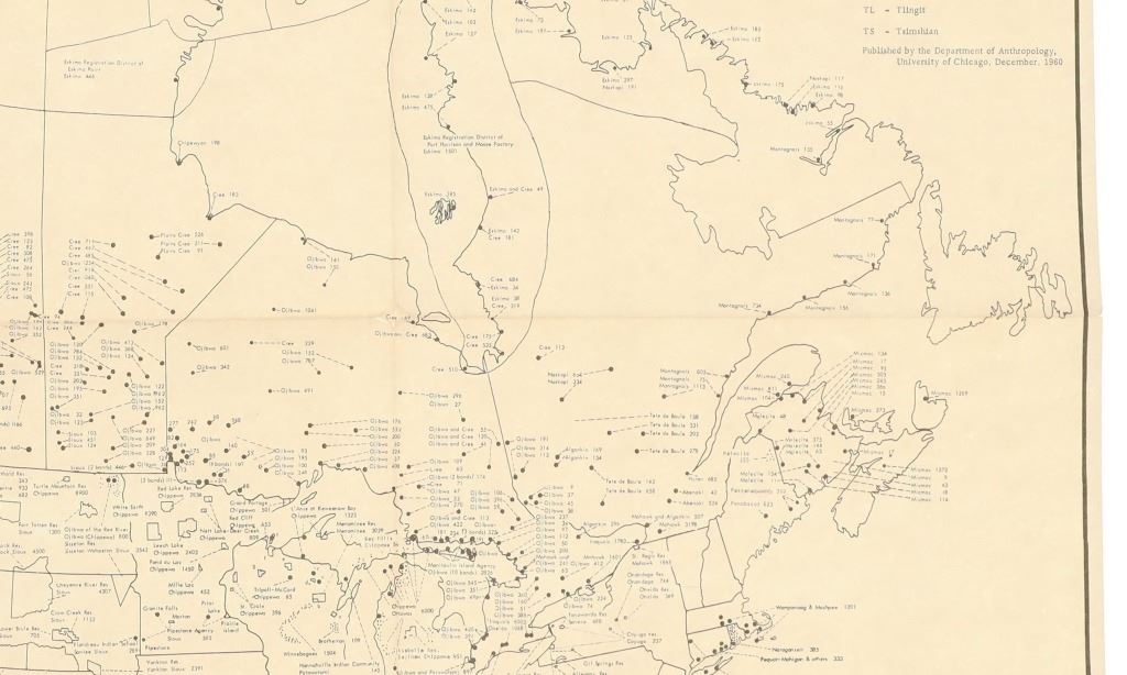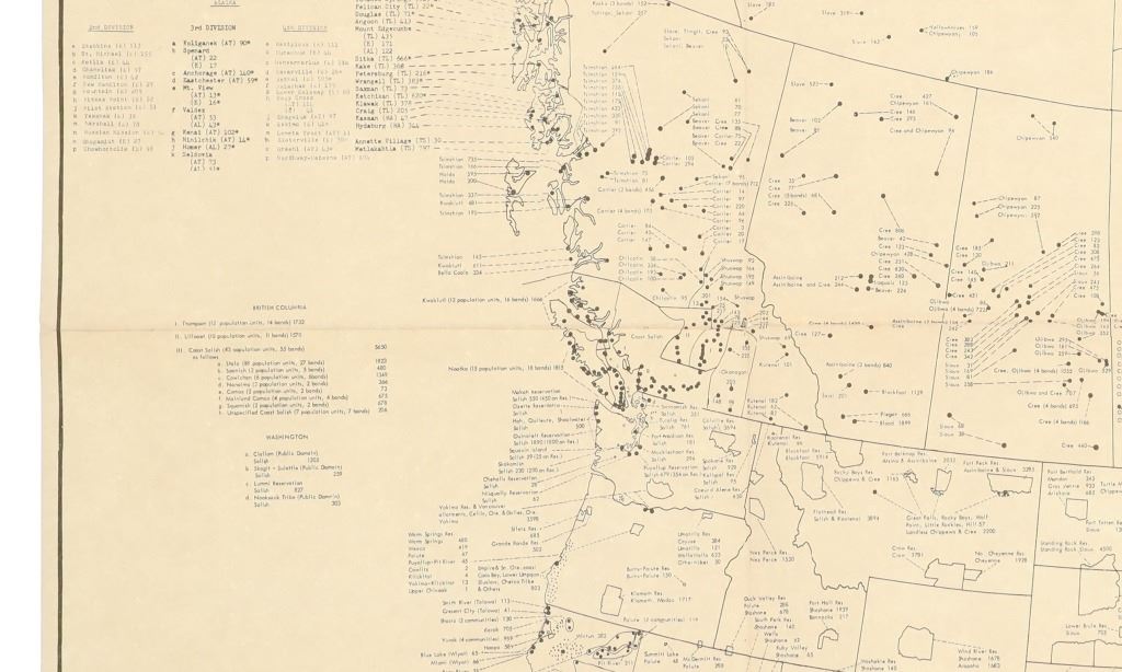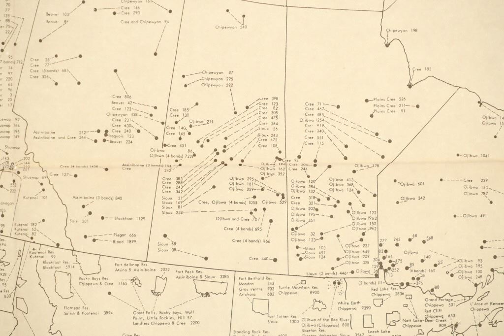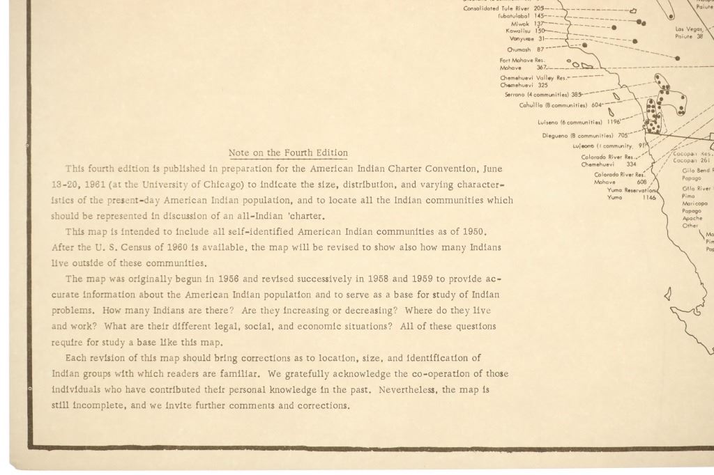 Featured in this lot is this North American Indian Distribution map circa 1950. The map features a wonderfully and professionally crafted paper construction that shows the network of Reservations throughout North America and Canada; this is a fourth edition and is a map of the 1950 distribution of descendants of the Aboriginal population of Alaska, Canada and the United States. The condition of this of this Distribution of Native Descendants map is good with no obvious signs of damage and shows good overall condition. The measurements of this map is 19" x 21 3/4".