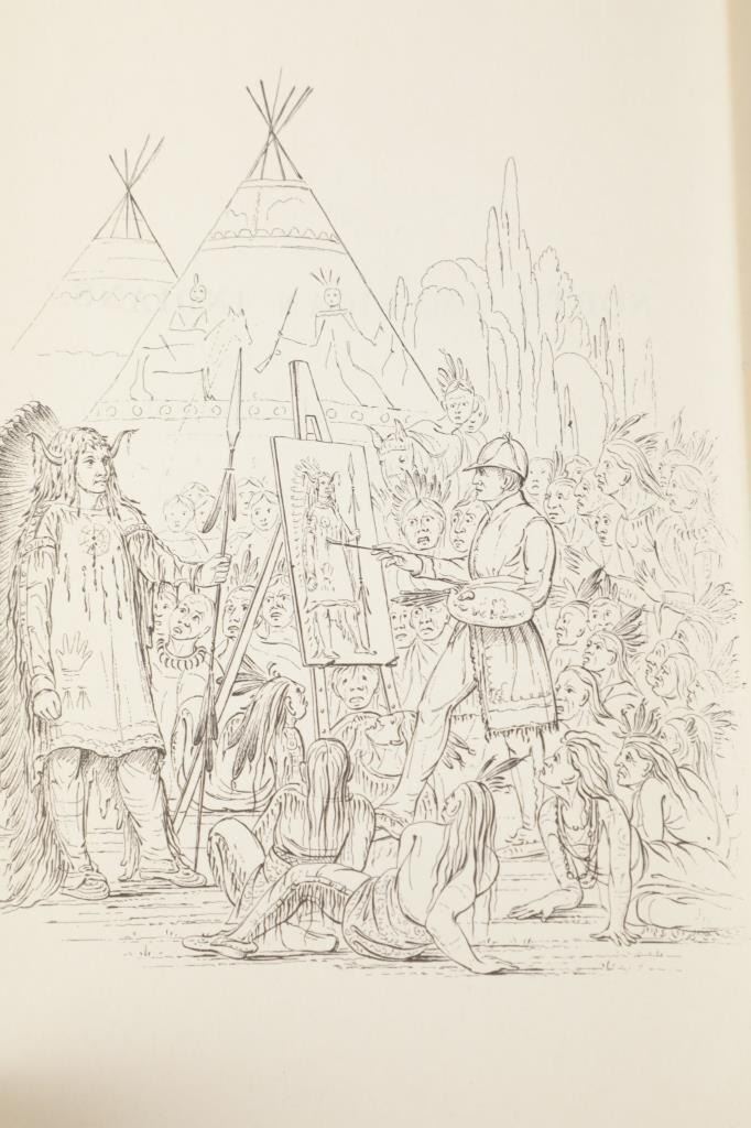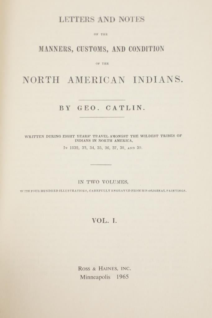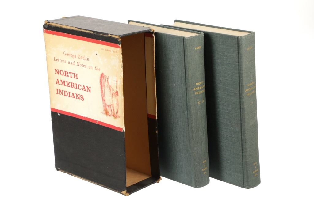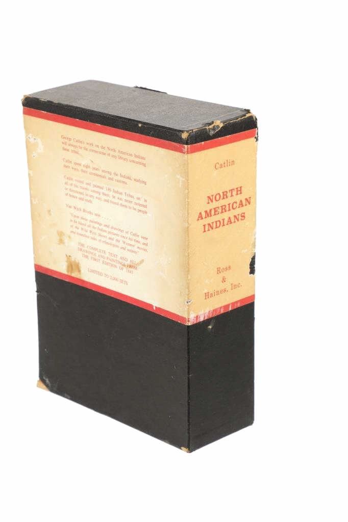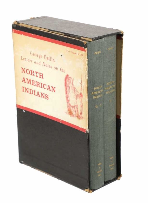 Featured in this lot we have the complete volumes I & II set of the North American Indians book by George Catlin. This hard copy special edition with sleeve was published by Ross & Haines Inc. Minneapolis and printed in 1965 from the first edition done in 1841. The complete title is, "Letters and Notes of the Manners, Customs, and Conditions of the North American Indians". The book was written during an eight years travel amongst the wildest tribes of Indians in North America during circa 1832-1839. He visited eighteen tribes, including the Pawnee, Ponca, and Omaha in the south and the Mandan, Hidatsa, Cheyenne, Crow, Assiniboine, and Blackfeet in the north. There he produced the most vivid and penetrating portraits of his career. George Catlin was an American adventurer, lawyer, painter, author, and traveler, who specialized in portraits of Native Americans in the Old West. Traveling to the American West five times during the 1830s, Catlin wrote about and painted portraits that depicted the life of the Plains Indians. The two volume set shows four hundred illustrations that were originally carefully engraved from Catlin's original paintings. The blue cloth bound gold gilt spine books are in good overall condition, slight scuffing noted to cover edges. Age tanning noted, no other obvious marring exhibited. Hardboard illustrated sleeve has separation along seams, age tanning exhibited. The books in an illustrated hard board sleeve measure 7"W x 10"L x 3"D.