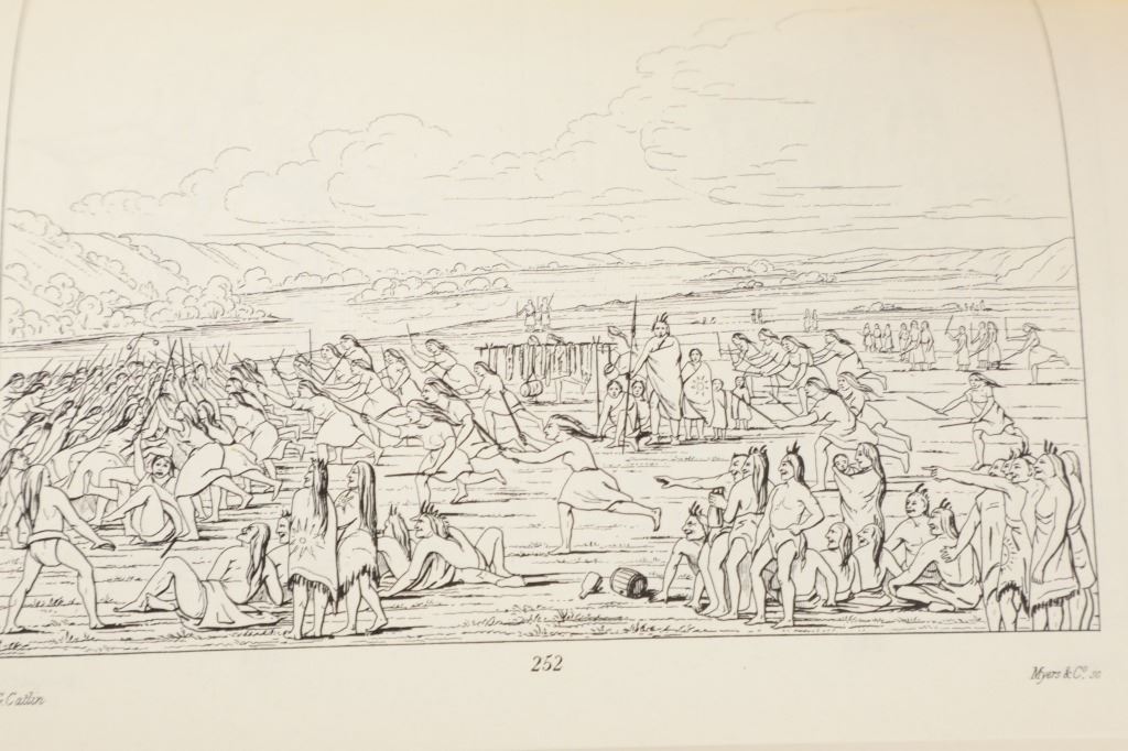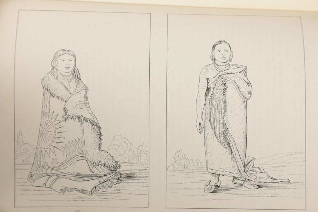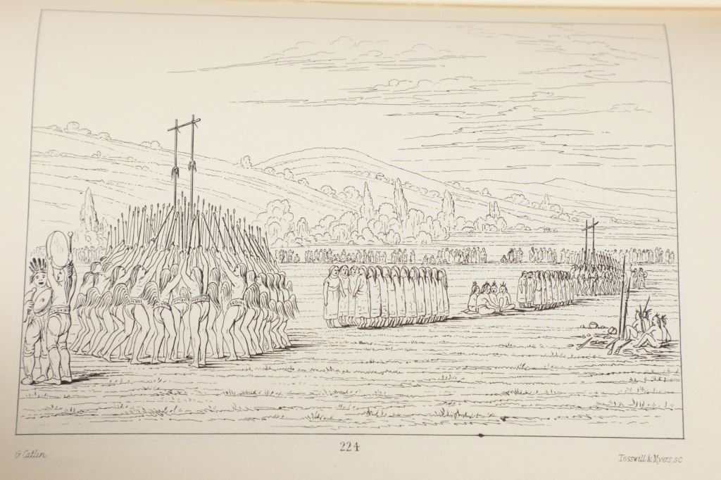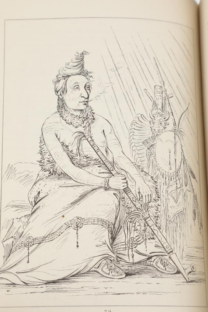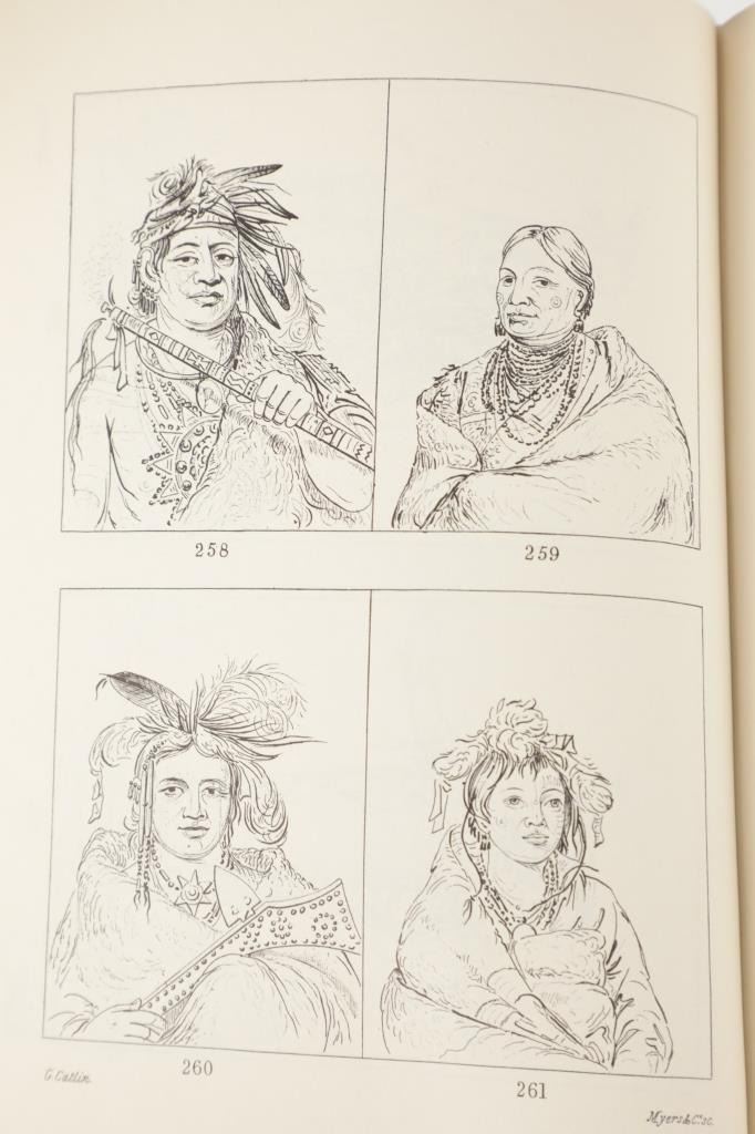 Featured in this lot we have the complete volumes I & II set of the North American Indians book by George Catlin. This hard copy special edition with sleeve was published by Ross & Haines Inc. Minneapolis and printed in 1965 from the first edition done in 1841. The complete title is, "Letters and Notes of the Manners, Customs, and Conditions of the North American Indians". The book was written during an eight years travel amongst the wildest tribes of Indians in North America during circa 1832-1839. He visited eighteen tribes, including the Pawnee, Ponca, and Omaha in the south and the Mandan, Hidatsa, Cheyenne, Crow, Assiniboine, and Blackfeet in the north. There he produced the most vivid and penetrating portraits of his career. George Catlin was an American adventurer, lawyer, painter, author, and traveler, who specialized in portraits of Native Americans in the Old West. Traveling to the American West five times during the 1830s, Catlin wrote about and painted portraits that depicted the life of the Plains Indians. The two volume set shows four hundred illustrations that were originally carefully engraved from Catlin's original paintings. The blue cloth bound gold gilt spine books are in good overall condition, slight scuffing noted to cover edges. Age tanning noted, no other obvious marring exhibited. Hardboard illustrated sleeve has separation along seams, age tanning exhibited. The books in an illustrated hard board sleeve measure 7"W x 10"L x 3"D.
