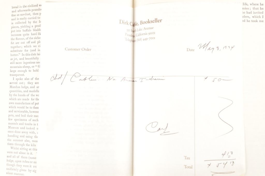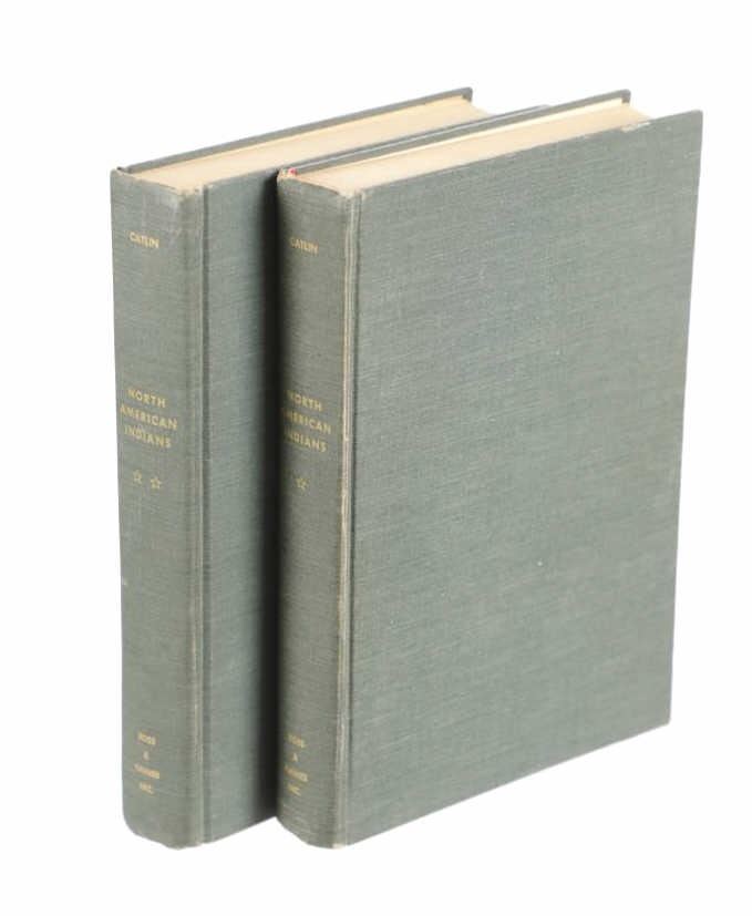 Featured in this lot we have the complete volumes I & II set of the North American Indians book by George Catlin. This hard copy special edition was published by Ross & Haines Inc. Minneapolis and printed in 1965 from the first edition done in 1841. The complete title is, "Letters and Notes of the Manners, Customs, and Conditions of the North American Indians". The book was written during an eight years travel amongst the wildest tribes of Indians in North America during circa 1832-1839. He visited eighteen tribes, including the Pawnee, Ponca, and Omaha in the south and the Mandan, Hidatsa, Cheyenne, Crow, Assiniboine, and Blackfeet in the north. There he produced the most vivid and penetrating portraits of his career. George Catlin was an American adventurer, lawyer, painter, author, and traveler, who specialized in portraits of Native Americans in the Old West. Traveling to the American West five times during the 1830s, Catlin wrote about and painted portraits that depicted the life of the Plains Indians. The two volume set shows four hundred illustrations that were originally carefully engraved from Catlin's original paintings. The blue cloth bound gold gilt hardcover books are in nice overall condition, slight scuffing noted to cover edges. Age tanning noted to intact pages, staining to fore edges on volume 2, no other obvious marring observed. Each measures 7"W x 10"L x 3"D. Total weight is 4lb, 4oz.