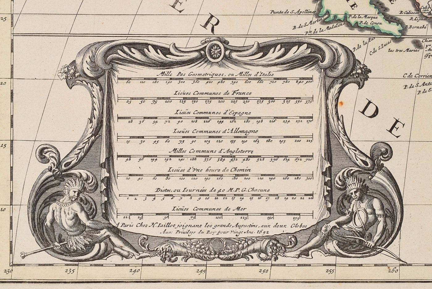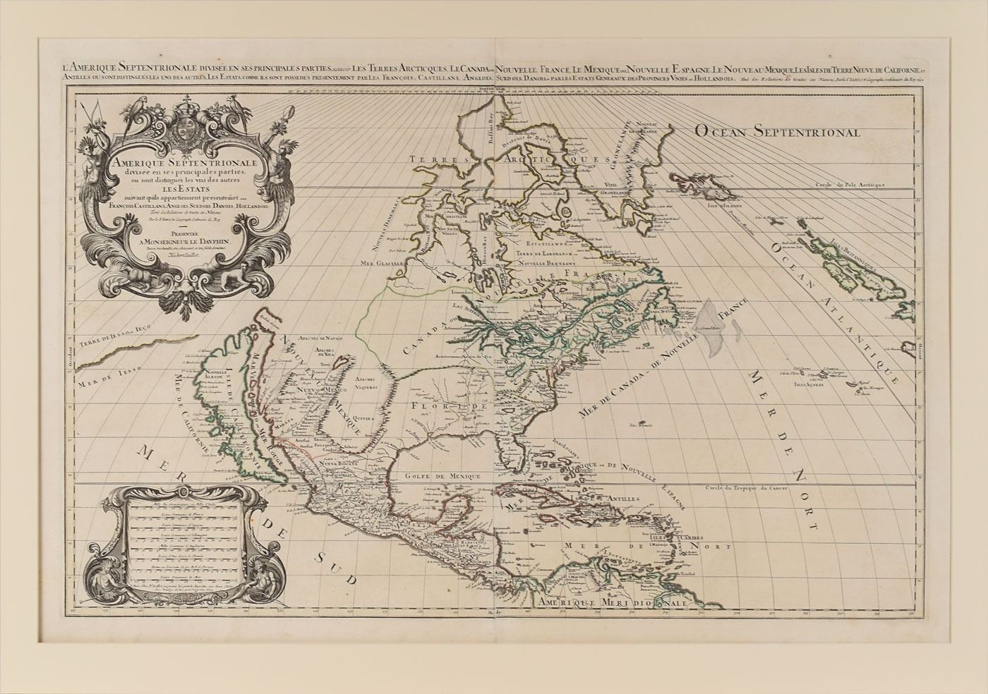 Magnificent 1692 map of North America published by Alexis Hubert Jaillot after Nicholas Sanson, 36 x 24, entitled “Amerique Septentrionale, Divisee en ses Principales Parties, ou sont Distingues les Uns des Autres les Estats Suivant qu'ils Appartiennet Presentemet aux Francois, Castillans, Anglois, Suedois, Danois, Hollandois.” The decorative title cartouche to the upper left is adorned with the French coat of arms, two Native Americans, and tropical birds atop; the distance scale cartouche to lower left is dated 1692 in the last line. Border outlines are hand-colored. Matted to an overall size of 39 x 27.5. In fine condition.