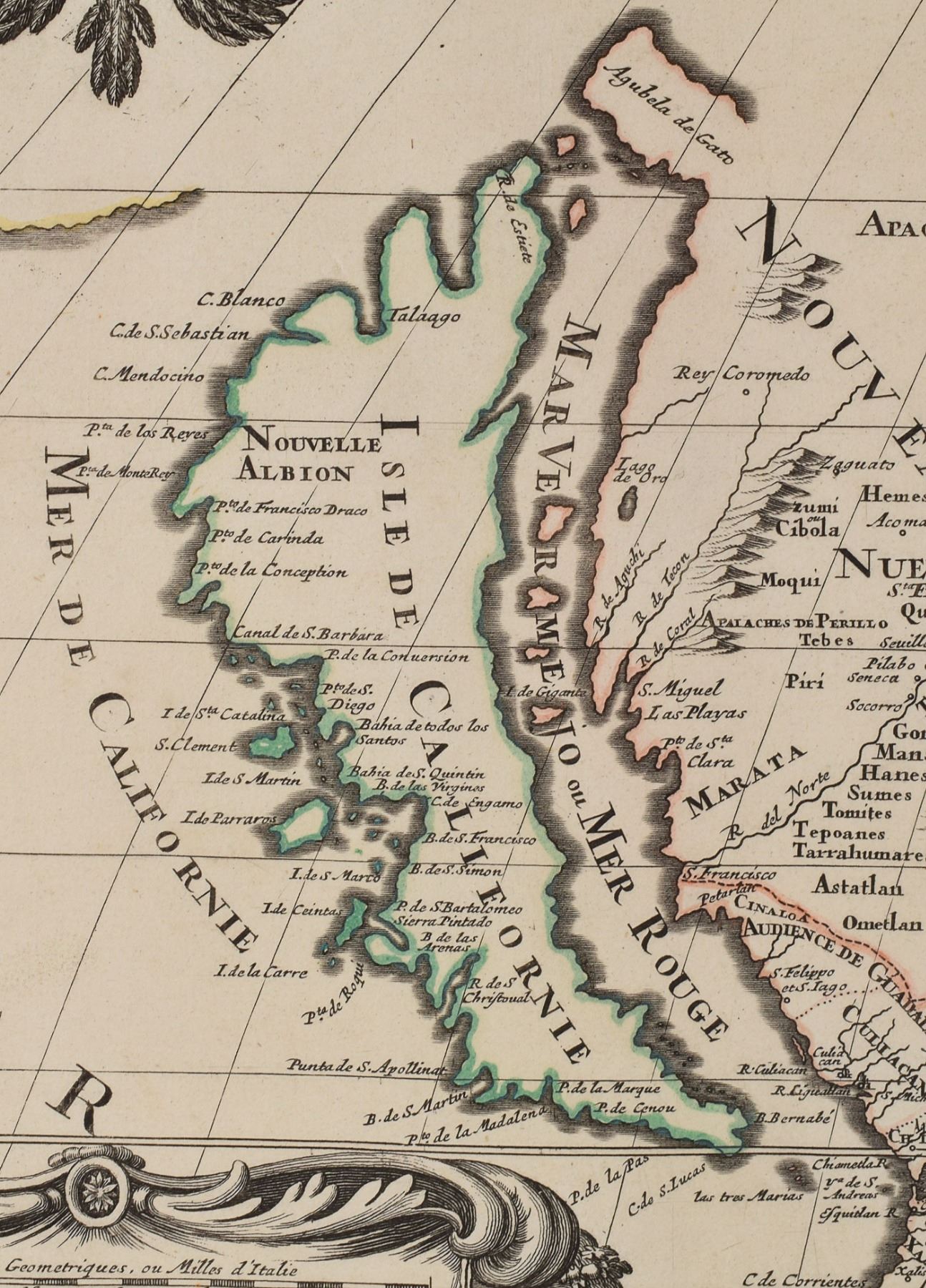 One of the most famous cartographic errors in history, this map portrays California as an island off the coast of Mexico. It correctly depicts the five Great Lakes, though Superior and Michigan are open-ended, and the western part of the continent is a vast unexplored territory. What is today the United States is largely divided between “Canada ou Nouvelle France,” “Floride,” and “Nouveau Mexique.” A simply remarkable, beautiful map of the ‘New World’ from the two hundredth anniversary of its discovery.