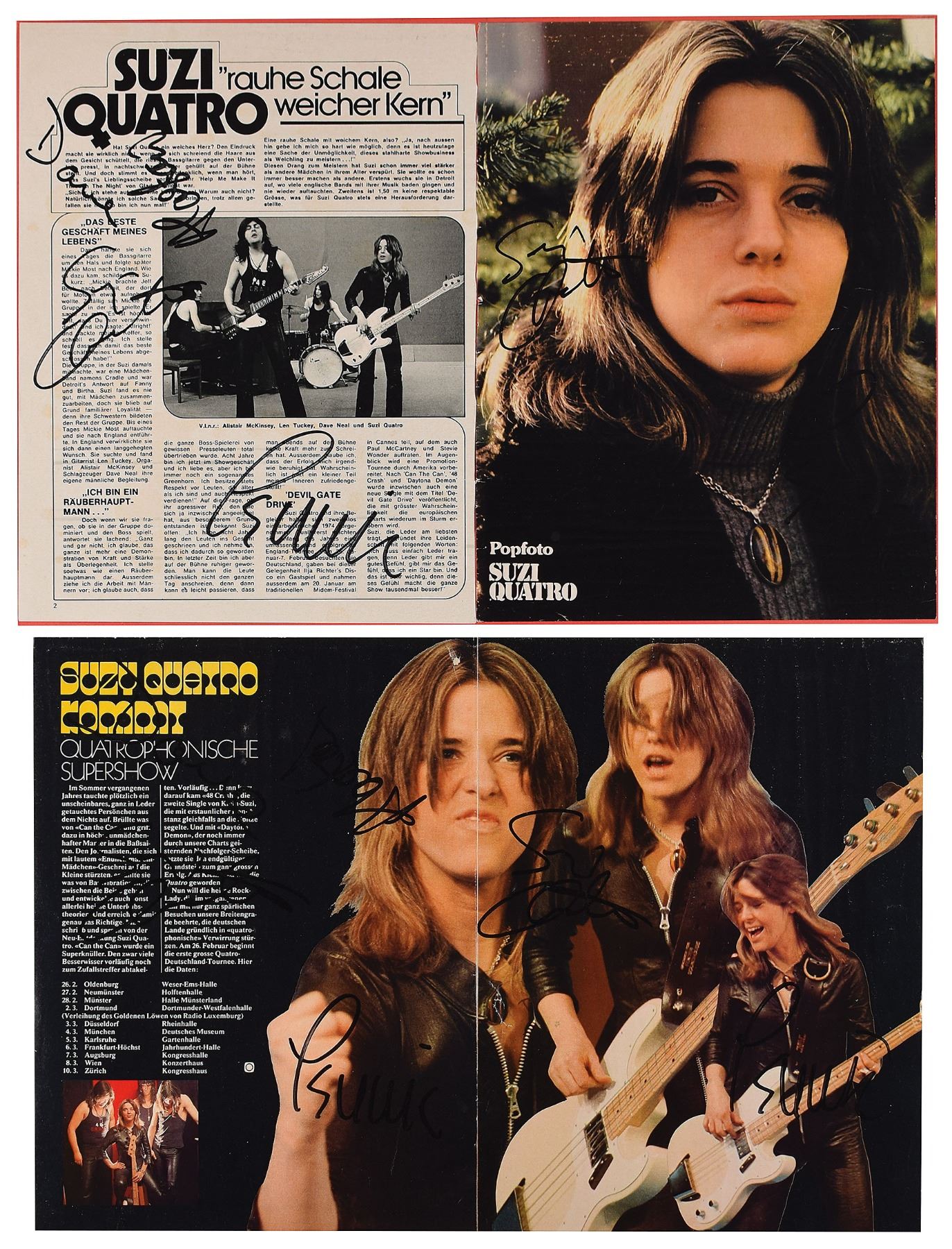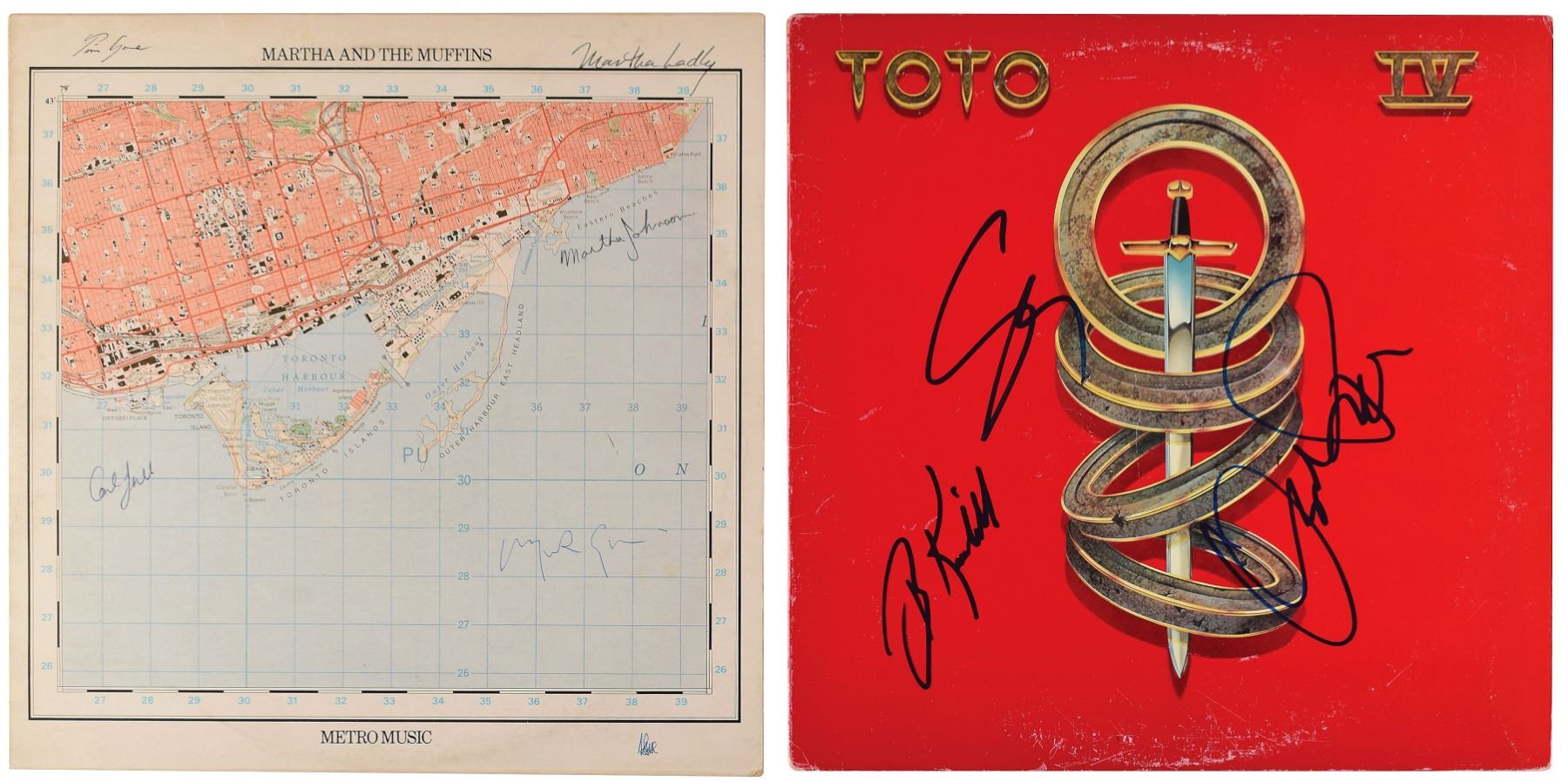 Six items signed by members of notable North American rock groups: a color glossy 8 x 10 photo of Foreigner (Al Greenwood, Dennis Elliott, Ed Gagliardi, Ian McDonald, Mick Jones, and Lou Gramm); Toto IV promotional album by Toto (David Paich, Steve Lukather, and Bobby Kimball); a Metro Music album by Martha and the Muffins (Martha Johnson, Martha Ladly, Mark Gane, Carl Finkle, Tim Gane, and Andy Haas); a DS related to Martha and the Muffins, dated November 1, 1982 (signed twice by Johnson and Gane); and two color German magazine photos of Suzi Quatro and her band (Quatro (4), Len Tuckey (3), Alastair McKenzie (2), and Dave Neal, who also signs twice). In overall very good to fine condition. The Toto record is not included. Accompanied by a full letter of authenticity from REAL for the Foreigner photo.