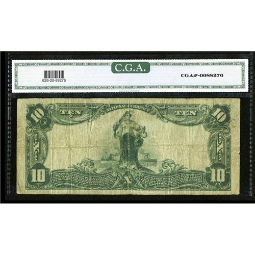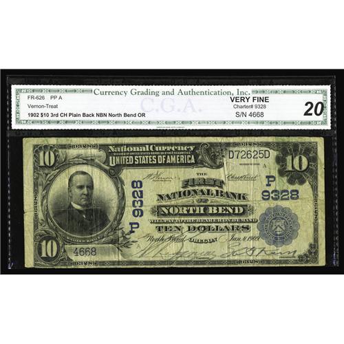<B>North Bend, OR</B></I> - $10 1902 Plain Back Fr. 626 <B>The First NB</B></I> Ch. # (P)9328<BR>Although small notes from here do turn up, large examples from this one bank Coos County location are very difficult to obtain. This pen signed specimen has been graded and encapsulated by CGA as <B>Very Fine 20,</B></I> although to our eye this is perhaps a trifle optimistic.