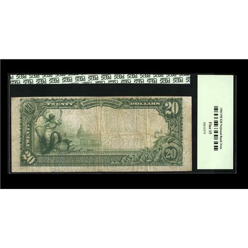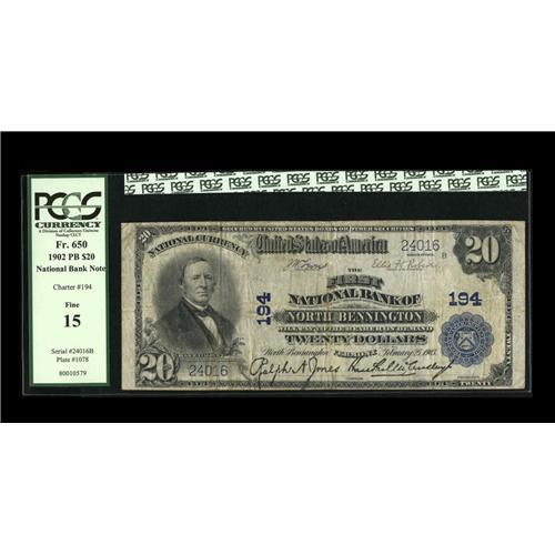 <B>North Bennington, VT</B></I> - $20 1902 Plain Back Fr. 650 <B>The First NB</B></I> Ch. # 194<BR>This is another Vermont bank which is exceedingly common in small size but seldom appears in large. It's an attractive piece with bold signatures that well deserves the grade of <B>Fine 15</B></I> awarded it by PCGS.
