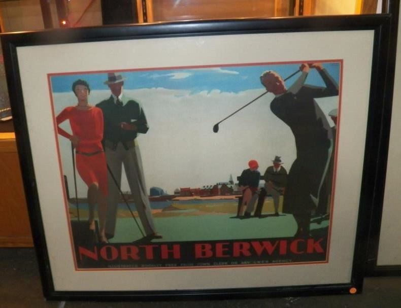 This vintage poster originally published to promote travel to the Primitive-era Scottish links course. Artwork is done by Andrew Johnson, probably circa 1920s Approx Frame Size 37" x 32"