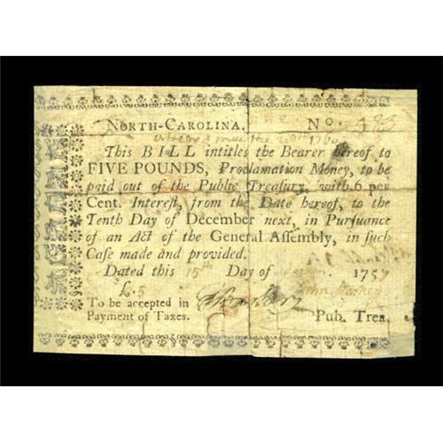 <B>North Carolina 1756 - 1757 (written dates) £5 Very Good-Fine.</B></I> This example which has been professionally restored shows a handwritten date of Decem. 15, 1757. This written date issue is particularly scarce and few examples are known to be in unadulterated states of preservation. In fact the whole issue is unpriced in Newman or Friedberg in any grade. This is the variety with "Payment" not hyphenated.<BR><BR><b>Shipping:</b> Coins & Currency (<a target="_blank" href="http://www.heritageauctions.com/common/shipping.php">view shipping information</a>)