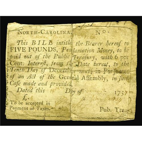 <B>North Carolina 1756 - 1757 (written dates) L5. Good-Very Good</B></I> This quite scarce note has been backed by another note. No valuation is given for this issue which has the date written as December 15, 1757. The note has been considerably trimmed. Any estimate here is solely conjecture and the value will be determined by the collectors.