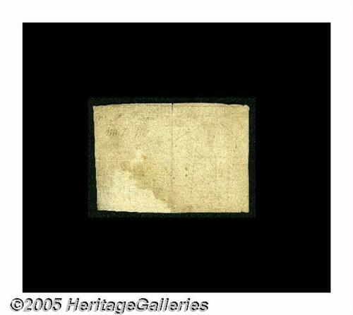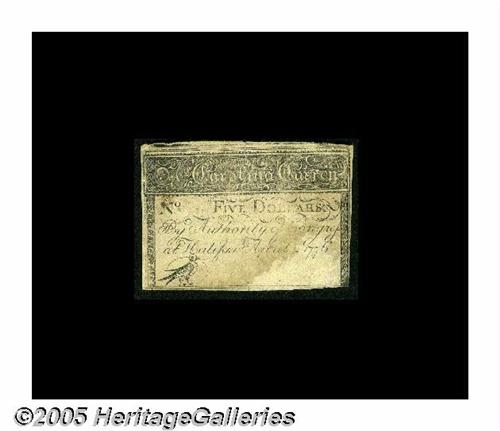 <B>North Carolina April 2, 1776 $5 Very Fine.</B></I> There are two varieties of $5 notes from this issue. This is the one with the Thrush vignette. It's a very well margined note, with a miniscule corner tip repair and a large but light stain. The vignette is razor sharp.