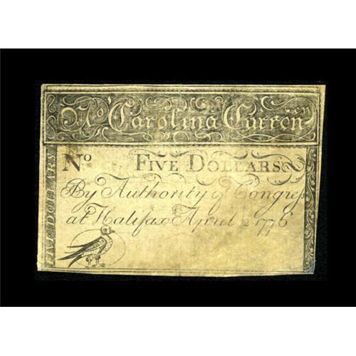 <B>North Carolina April 2, 1776 $5 Very Fine.</B></I> There are two varieties of $5 notes from this 1776 issue. This is the variety with the <I>thrush </B></I> vignette and in this case it is razor sharp. The note is nicely margined for the issue. It also has a miniscule corner tip repair and a large, but light stain. <BR><BR><b>Shipping:</b> Coins & Currency (<a target="_blank" href="http://www.heritageauctions.com/common/shipping.php">view shipping information</a>)