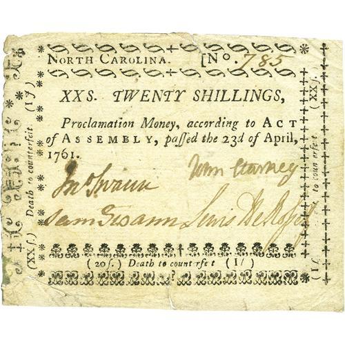<B>North Carolina April 23, 1761 20s Extremely Fine.</B></I> Here is a solid example that is problem-free, nicely signed, and in an unusually high grade for the issue.