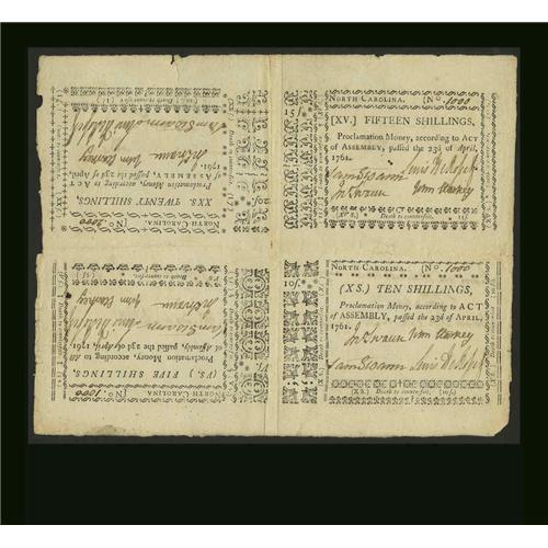 <B>North Carolina April 23, 1761 Original Block of Four Extremely Fine.</B></I> The only multiple that we can recall seeing of this issue. The block contains one of each of the 5s, 10s, 15s, and 20s notes. All four notes are fully signed and numbered. Interestingly, the three lower denomination notes are all serial number 1000, and the larger denominations are serial number 2000. Each note is mildly affected by a light fold and the 5s has a small hole, but each of the four notes is a rarity in its own right in this grade. All four notes have identical endorsements on the back that indicate they too place in at least one commercial transaction. A great item for the North Carolina specialist.