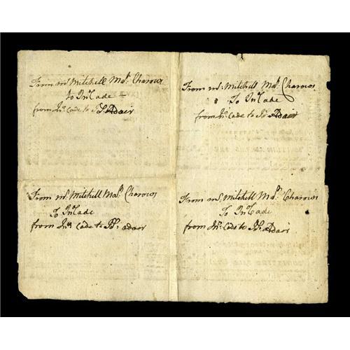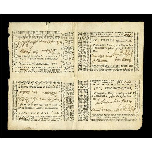 <B>North Carolina April 23, 1761 Original Block of Four Extremely Fine.</B></I> This is the only multiple that we can recall seeing of this issue. The block contains one of each of the 5s, 10s, 15s, and 20s notes. All four notes are fully signed and numbered. Interestingly, the three lower denomination notes are all serial number 1000, and the 20s note is serial number 2000. Each note is mildly affected by a light fold and the 5s has a small hole, but each of the four notes is a rarity in its own right in this grade. All four notes have identical endorsements on the back that indicate these notes participated in at least one commercial transaction. A great item for the North Carolina specialist.<BR><BR><b>Shipping:</b> Coin/Currency (<a target="_blank" href="http://www.heritageauctions.com/common/shipping.php">view shipping information</a>)